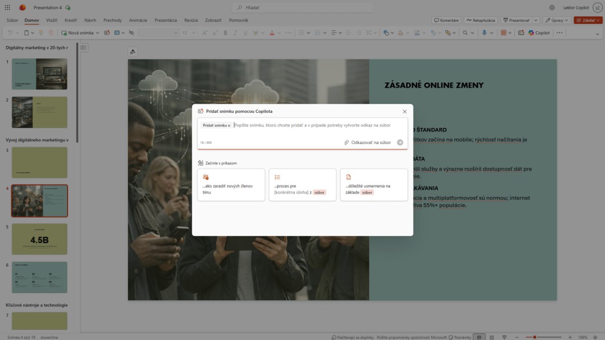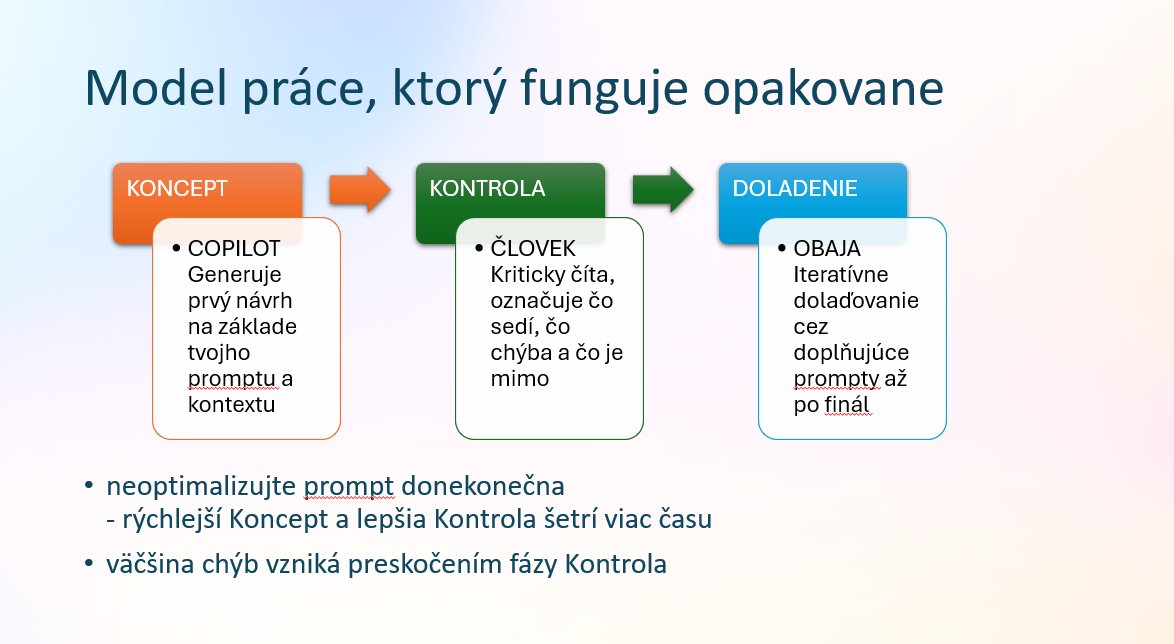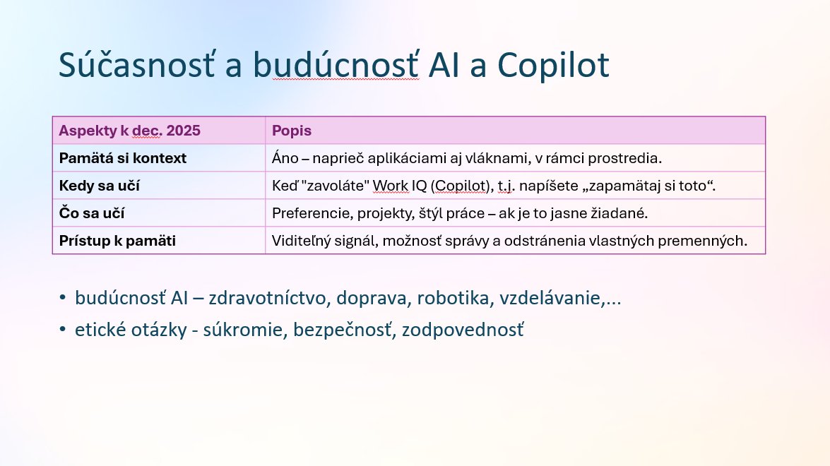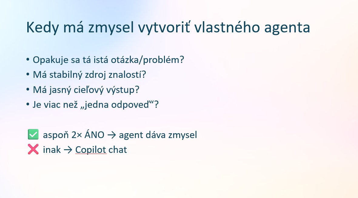 Kurz je určený pre ľudí, ktorí už majú za sebou základy práce s Copilotom a chcú posunúť využitie na úroveň, kde to začína šetriť čas naozaj viditeľne. Osloví analytikov, projektových manažérov, HR špeciaListov, sales tímy – v podstate každého, kto denne žongluje s viacerými kanálmi komunikácie a dokumentmi. Predpokladáme, že viete, čo je prompt, ako Copilot reaguje na základné inštrukcie a že ste aspoň raz skúšali generovať obsah v Worde alebo Exceli. Ak ste s Copilotom ešte nepracovali, odporúčame si pozrieť osnovu predchádzajúceho kurzu. Na tomto kurze sa sústredíme čisto na to, čo viete spustiť v rámci M365 prostredia bez zložitejšieho vývoja pomocou Copilot Studio (samostatná licencia) – a je to prekvapivo veľa.