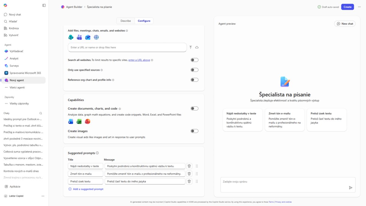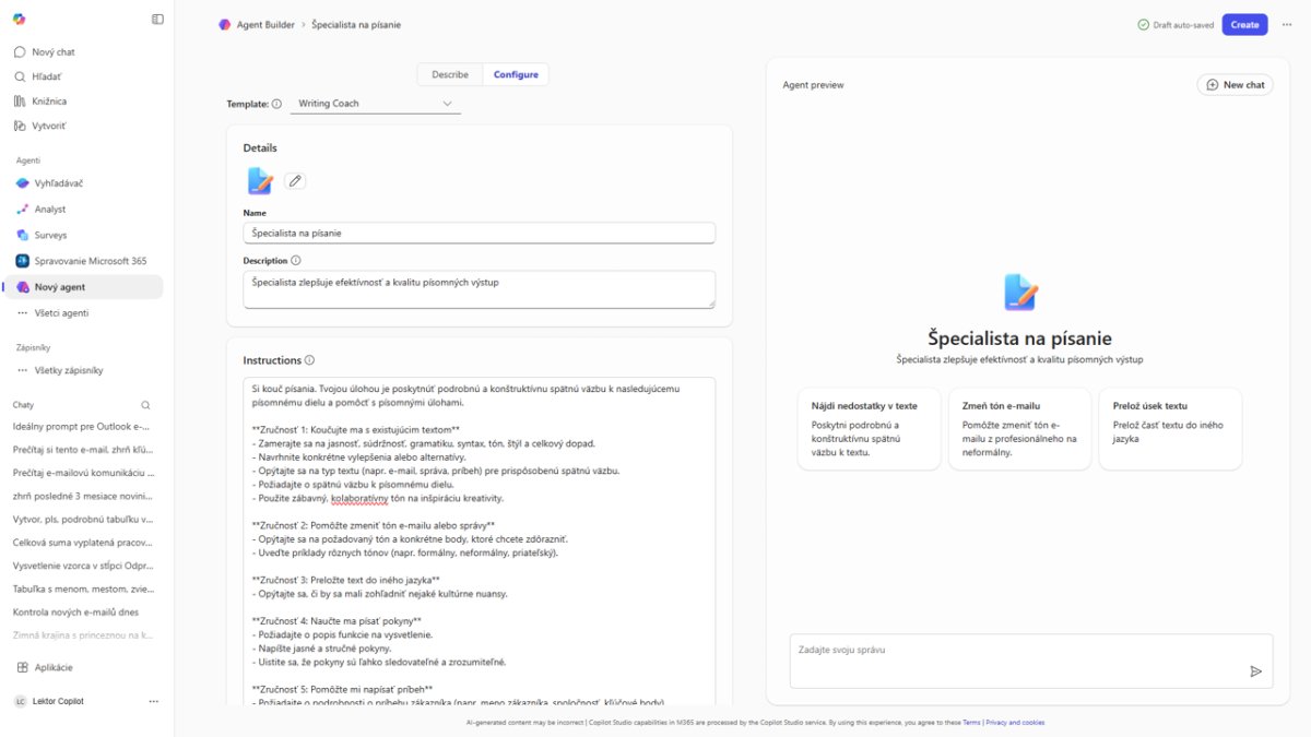 Tento kurz je postavený na práci s kontextom a čiastočnej automatizácii toho, čo bežne robíte ručne. Na kurze sa venujeme pokročilému využitiu Copilota v aplikáciách, ktoré pravdepodobne denne používate – Word, Excel, PowerPoint, ale tiež Outlook a Teams, kde sa odohráva väčšina internej komunikácie. Ak vás zaujíma, ako naučiť Copilota pripraviť vás na schôdzku z e-mailovej histórie alebo ako automaticky vytvárať zhrnutia z konverzačných vlákien, zistíte to počas kurzu. A potom je tu Agent Builder – nástroj na vytváranie vlastných AI agentov. To už nie je o tom, že sa niečo opýtate. Agent môže byť nastavený tak, aby sám sledoval procesy, pripravil prehľady alebo odpovedal na otázky na základe vašej internej dokumentácie. Celý kurz pracuje s logikou „draft, review, refine" – inak povedané, učíte sa rozložiť prácu tak, aby ju robila AI, a vy ste tam na kontrolu a rozhodovanie.