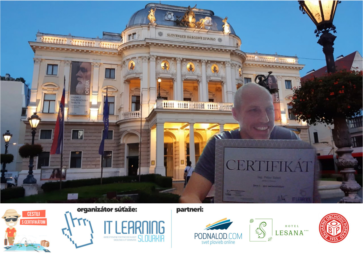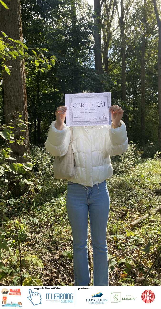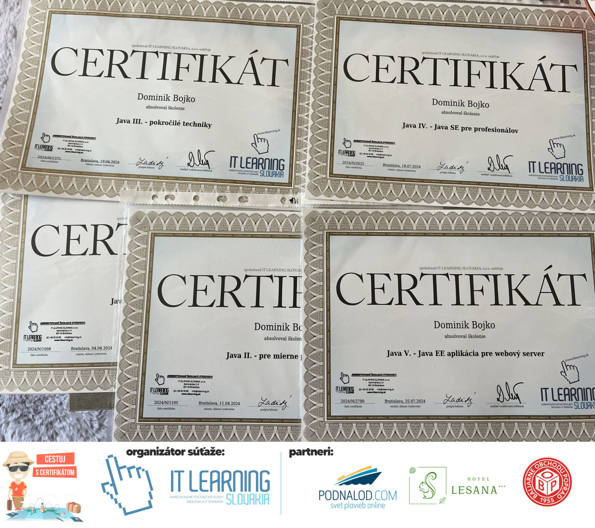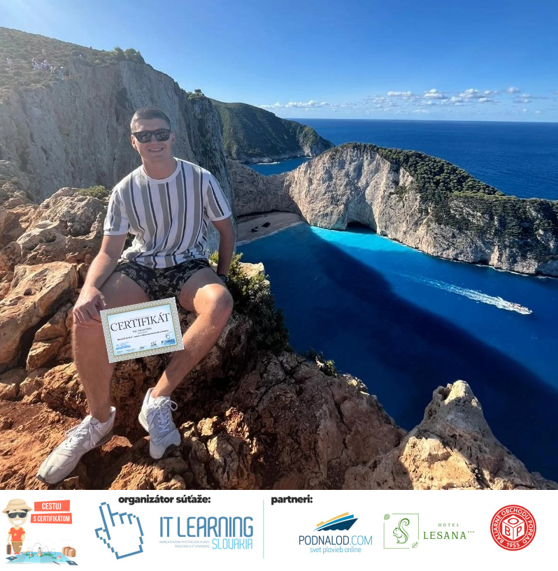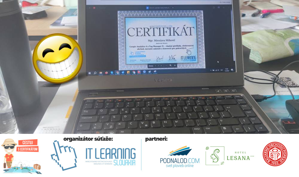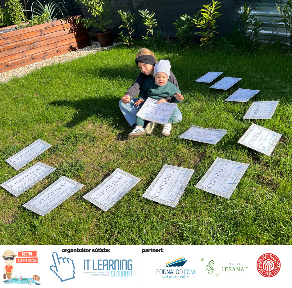 Podmienky a pravidlá súťaže: Organizátorom súťaže je akreditované školiace a IT vzdelávacie stredisko IT LEARNING SLOVAKIA, s.r.o. Zmena podmienok je vyhradená. Zaslaním fotografie súhlasíte s podmienkami, ako aj s uverejnením zaslanej fotografie na našich oficiálnych webstránkach a na sociálnych sieťach. Jeden súťažiaci a teda jeden účastník kurzu môže prihlásiť maximálne 3 fotografie. Súťaž je určená výhradne pre účastníkov našich kurzov, ktorí majú certifikát vystavený na svoje meno a odovzdávanie ceny je podmienené kontrolou mena súťažiaceho s menom  na prezenčnej listine po kurze. Do súťaže sa nesmú zapojiť zamestnanci spoločnosti pracujúci na trvalý pracovný pomer, interný ani externí lektori pracujúci na živnosť či dohodu. Prihlásiť sa certifikát môžu a rodičia detí, ktorí absolvovali tábor a teda fotografiou certifikátu z tábora. Fotografie môžu byť použité na marketingové účely šírené internetovou formou. Na výhru neexistuje právny nárok. Na zaradenie fotografie do súťaže taktiež nevzniká nárok a vyhradzujeme si právo na odmietnutie akejkoľvek prihlásenej fotografie bez uvedenia dôvodu. Fotografie nízkej kvality alebo zobrazujúce nevhodnú situáciu či objekt, vulgárne či, značne retušované zaradené do súťaže nebudú. Spoločnosť sa zaväzuje chrániť vaše osobné údaje, ktoré nebudú poskytnuté tretím osobám v súlade s aktuálne platným zákonom o ochrane osobných údajov GDPR. Email poskytnutý do súťaže bude výhradne použitý iba na informačné emaily ohľadom súťaže. Zmena pravidiel, cien v súťaži či termínov odovzdávania cien a pravidiel vyhradená. Všetky výhry prislúchajú výhradne súťažiacemu a výhercovi, ktorý ju smie využiť a je neprenosná. Pobytové poukazy a zájazdy sú viazané na meno účastníka v súťaži. Prístup do VideoClass sa aktivuje automaticky na e-mail, z ktorého bola odoslaná registrácia fotografie, a to na obdobie 60 dní od schválenia a overenia fotografie našimi zamestnancami.