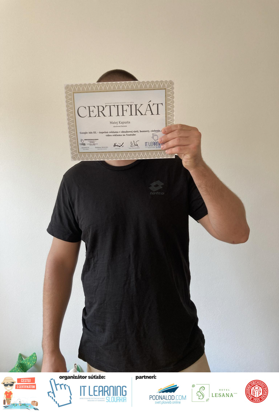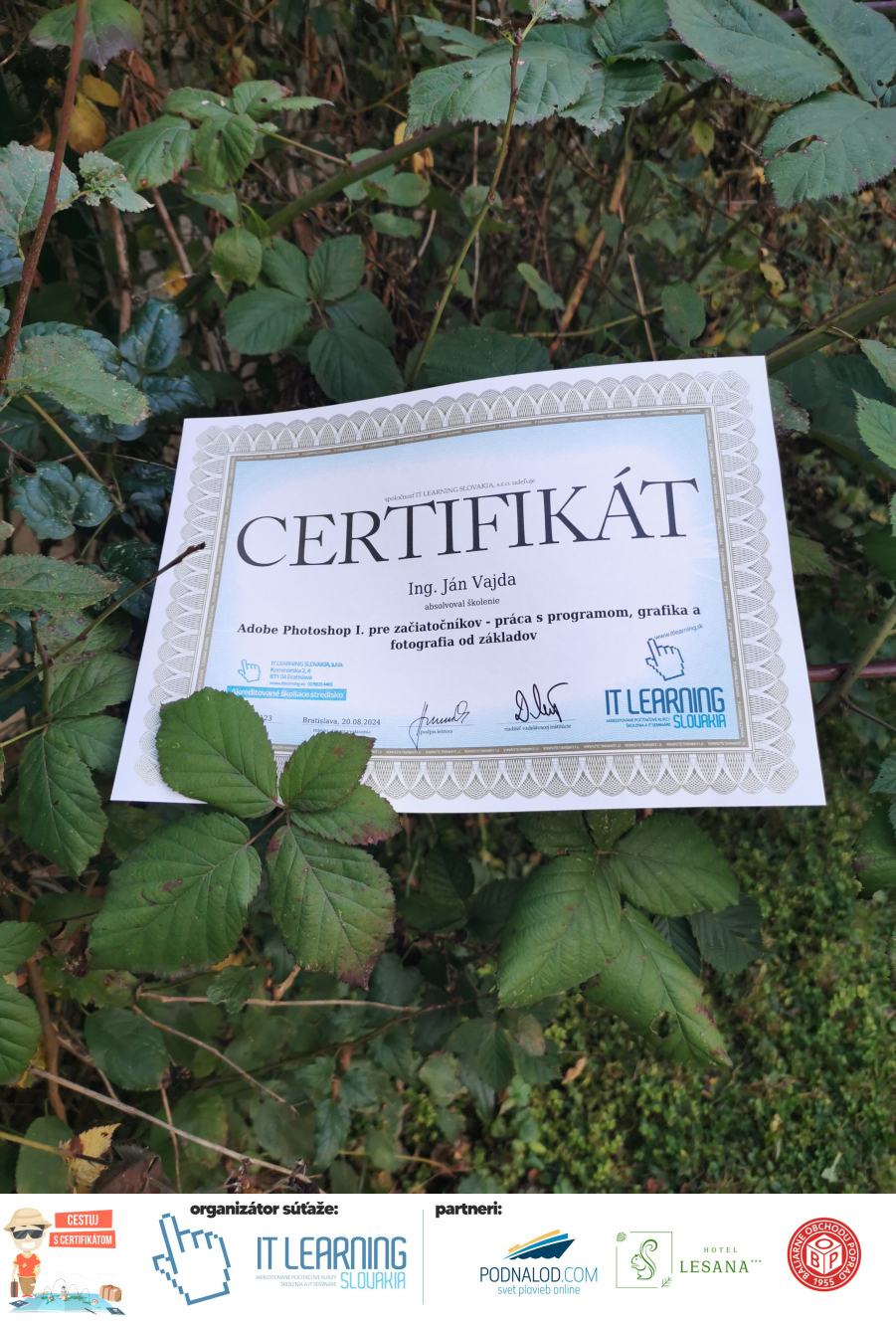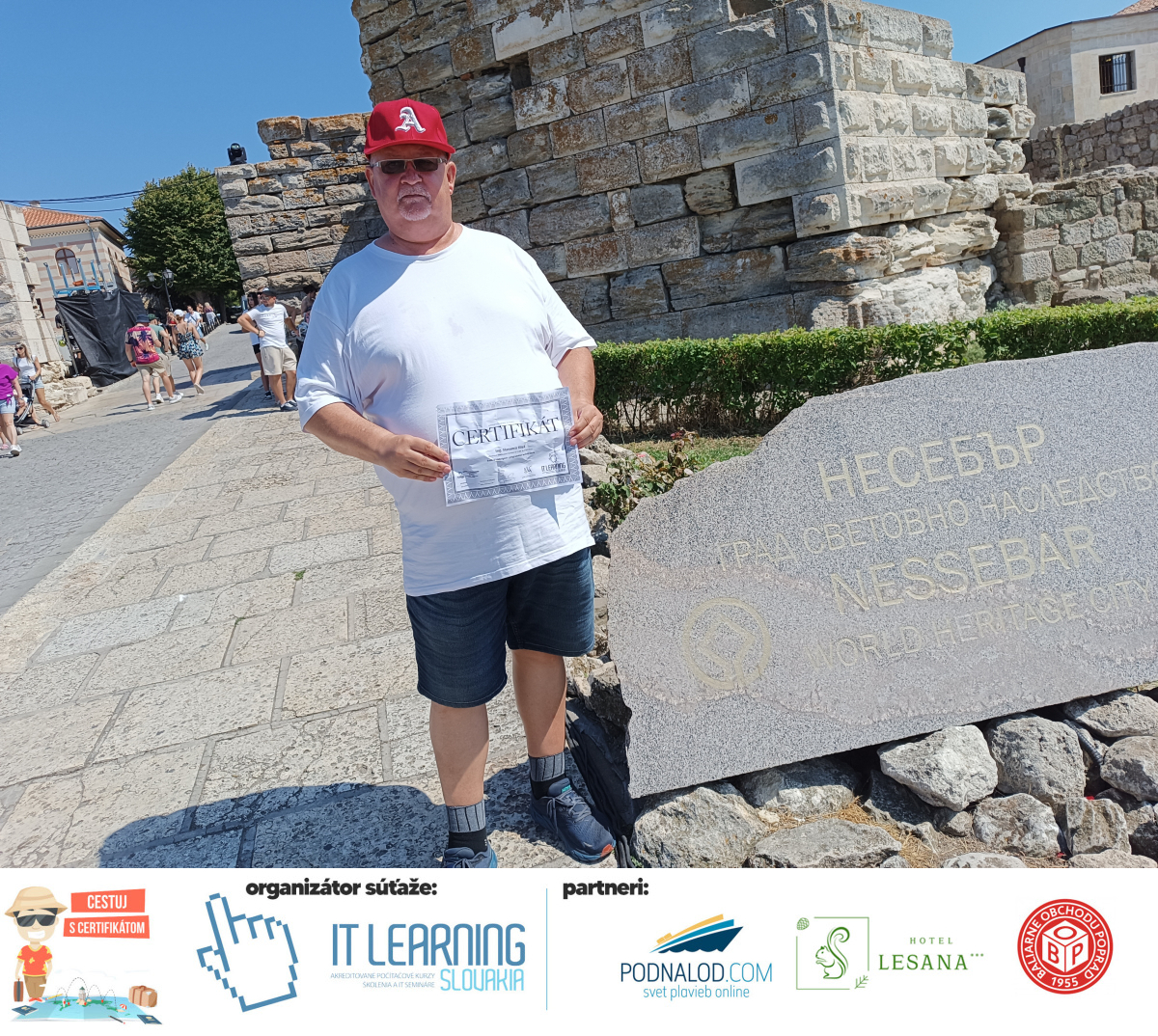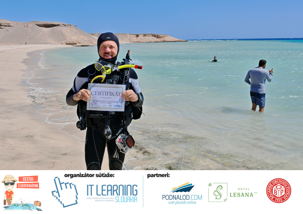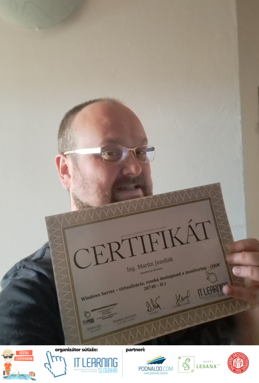 Podmienky a pravidlá súťaže: Organizátorom súťaže je akreditované školiace a IT vzdelávacie stredisko IT LEARNING SLOVAKIA, s.r.o. Zmena podmienok je vyhradená. Zaslaním fotografie súhlasíte s podmienkami, ako aj s uverejnením zaslanej fotografie na našich oficiálnych webstránkach a na sociálnych sieťach. Jeden súťažiaci a teda jeden účastník kurzu môže prihlásiť maximálne 3 fotografie. Súťaž je určená výhradne pre účastníkov našich kurzov, ktorí majú certifikát vystavený na svoje meno a odovzdávanie ceny je podmienené kontrolou mena súťažiaceho s menom  na prezenčnej listine po kurze. Do súťaže sa nesmú zapojiť zamestnanci spoločnosti pracujúci na trvalý pracovný pomer, interný ani externí lektori pracujúci na živnosť či dohodu. Prihlásiť sa certifikát môžu a rodičia detí, ktorí absolvovali tábor a teda fotografiou certifikátu z tábora. Fotografie môžu byť použité na marketingové účely šírené internetovou formou. Na výhru neexistuje právny nárok. Na zaradenie fotografie do súťaže taktiež nevzniká nárok a vyhradzujeme si právo na odmietnutie akejkoľvek prihlásenej fotografie bez uvedenia dôvodu. Fotografie nízkej kvality alebo zobrazujúce nevhodnú situáciu či objekt, vulgárne či, značne retušované zaradené do súťaže nebudú. Spoločnosť sa zaväzuje chrániť vaše osobné údaje, ktoré nebudú poskytnuté tretím osobám v súlade s aktuálne platným zákonom o ochrane osobných údajov GDPR. Email poskytnutý do súťaže bude výhradne použitý iba na informačné emaily ohľadom súťaže. Zmena pravidiel, cien v súťaži či termínov odovzdávania cien a pravidiel vyhradená. Všetky výhry prislúchajú výhradne súťažiacemu a výhercovi, ktorý ju smie využiť a je neprenosná. Pobytové poukazy a zájazdy sú viazané na meno účastníka v súťaži. Prístup do VideoClass sa aktivuje automaticky na e-mail, z ktorého bola odoslaná registrácia fotografie, a to na obdobie 60 dní od schválenia a overenia fotografie našimi zamestnancami.