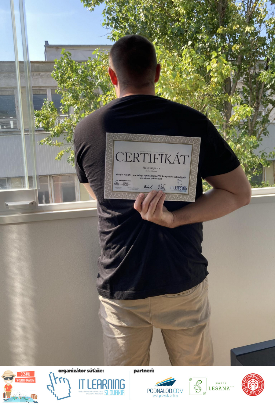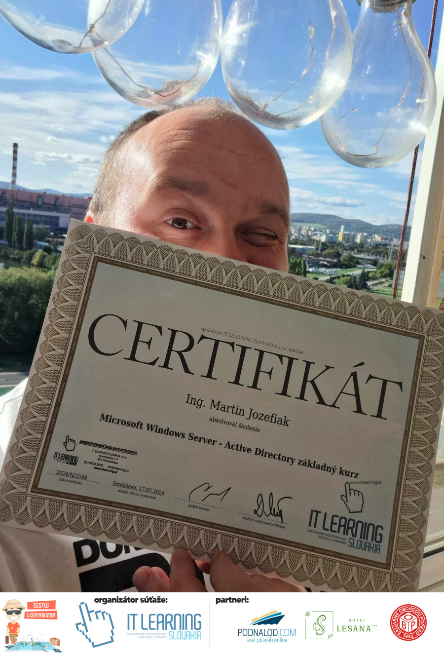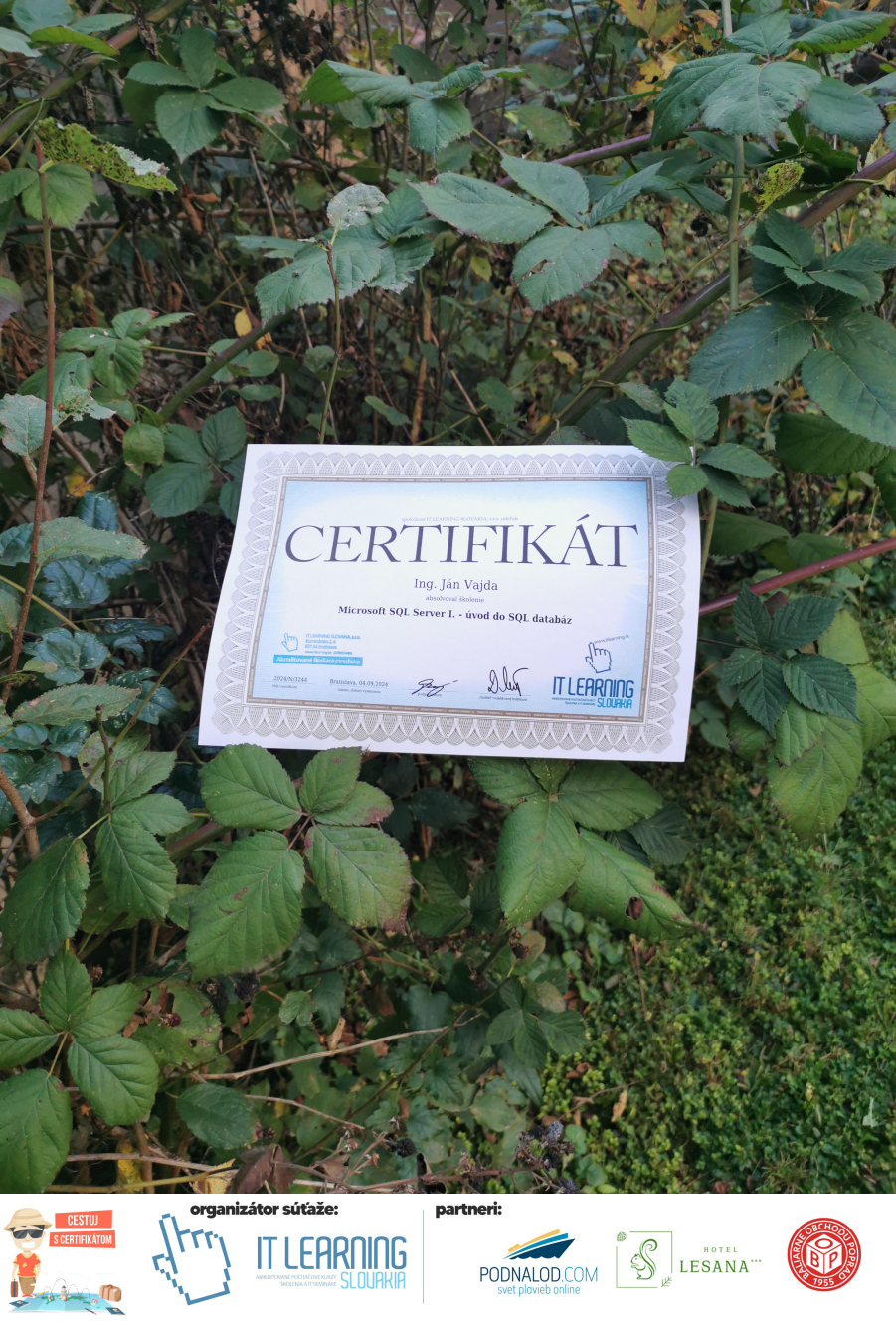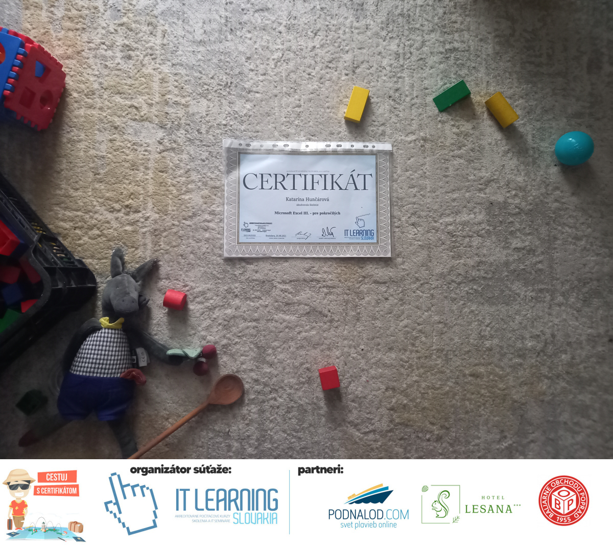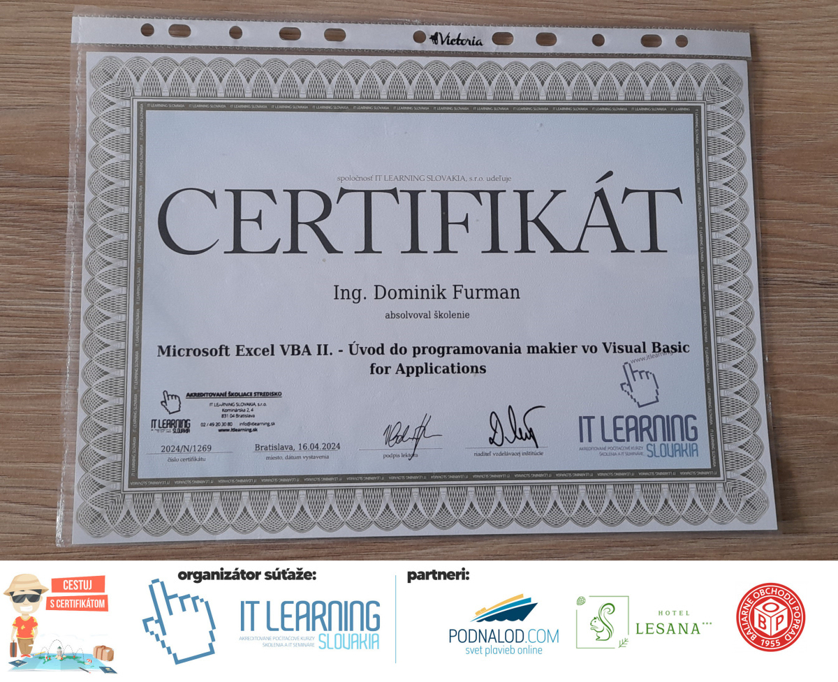 Podmienky a pravidlá súťaže: Organizátorom súťaže je akreditované školiace a IT vzdelávacie stredisko IT LEARNING SLOVAKIA, s.r.o. Zmena podmienok je vyhradená. Zaslaním fotografie súhlasíte s podmienkami, ako aj s uverejnením zaslanej fotografie na našich oficiálnych webstránkach a na sociálnych sieťach. Jeden súťažiaci a teda jeden účastník kurzu môže prihlásiť maximálne 3 fotografie. Súťaž je určená výhradne pre účastníkov našich kurzov, ktorí majú certifikát vystavený na svoje meno a odovzdávanie ceny je podmienené kontrolou mena súťažiaceho s menom  na prezenčnej listine po kurze. Do súťaže sa nesmú zapojiť zamestnanci spoločnosti pracujúci na trvalý pracovný pomer, interný ani externí lektori pracujúci na živnosť či dohodu. Prihlásiť sa certifikát môžu a rodičia detí, ktorí absolvovali tábor a teda fotografiou certifikátu z tábora. Fotografie môžu byť použité na marketingové účely šírené internetovou formou. Na výhru neexistuje právny nárok. Na zaradenie fotografie do súťaže taktiež nevzniká nárok a vyhradzujeme si právo na odmietnutie akejkoľvek prihlásenej fotografie bez uvedenia dôvodu. Fotografie nízkej kvality alebo zobrazujúce nevhodnú situáciu či objekt, vulgárne či, značne retušované zaradené do súťaže nebudú. Spoločnosť sa zaväzuje chrániť vaše osobné údaje, ktoré nebudú poskytnuté tretím osobám v súlade s aktuálne platným zákonom o ochrane osobných údajov GDPR. Email poskytnutý do súťaže bude výhradne použitý iba na informačné emaily ohľadom súťaže. Zmena pravidiel, cien v súťaži či termínov odovzdávania cien a pravidiel vyhradená. Všetky výhry prislúchajú výhradne súťažiacemu a výhercovi, ktorý ju smie využiť a je neprenosná. Pobytové poukazy a zájazdy sú viazané na meno účastníka v súťaži. Prístup do VideoClass sa aktivuje automaticky na e-mail, z ktorého bola odoslaná registrácia fotografie, a to na obdobie 60 dní od schválenia a overenia fotografie našimi zamestnancami.