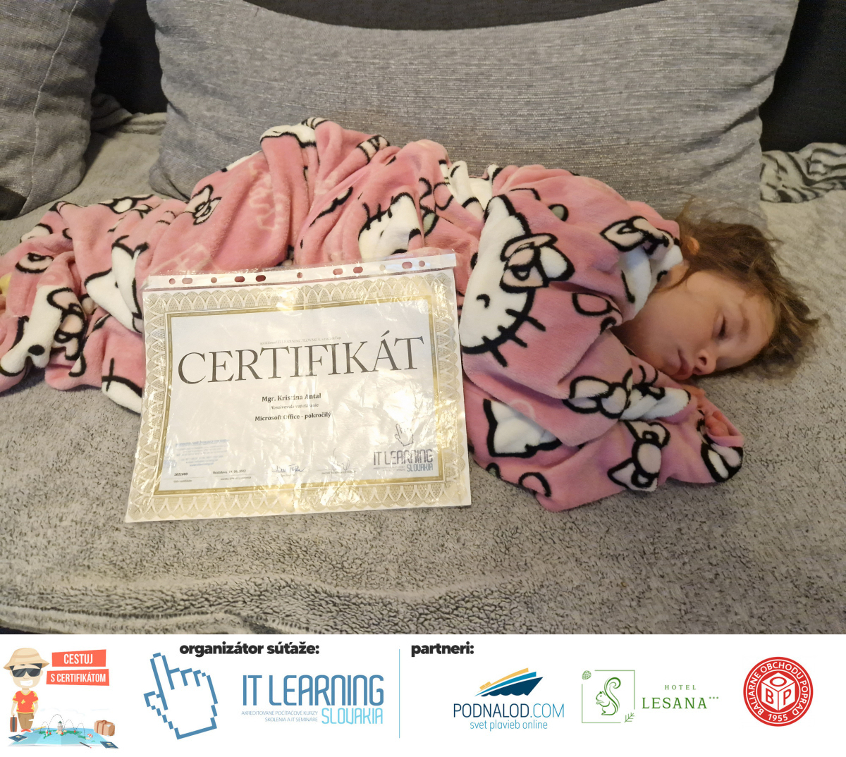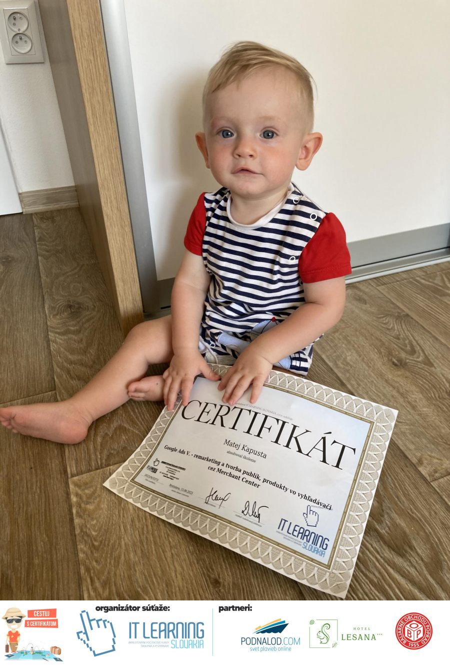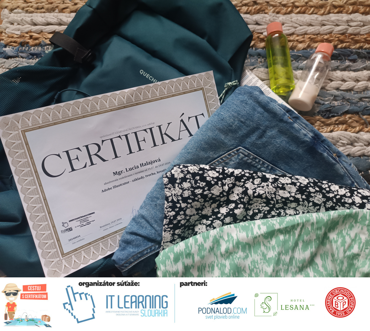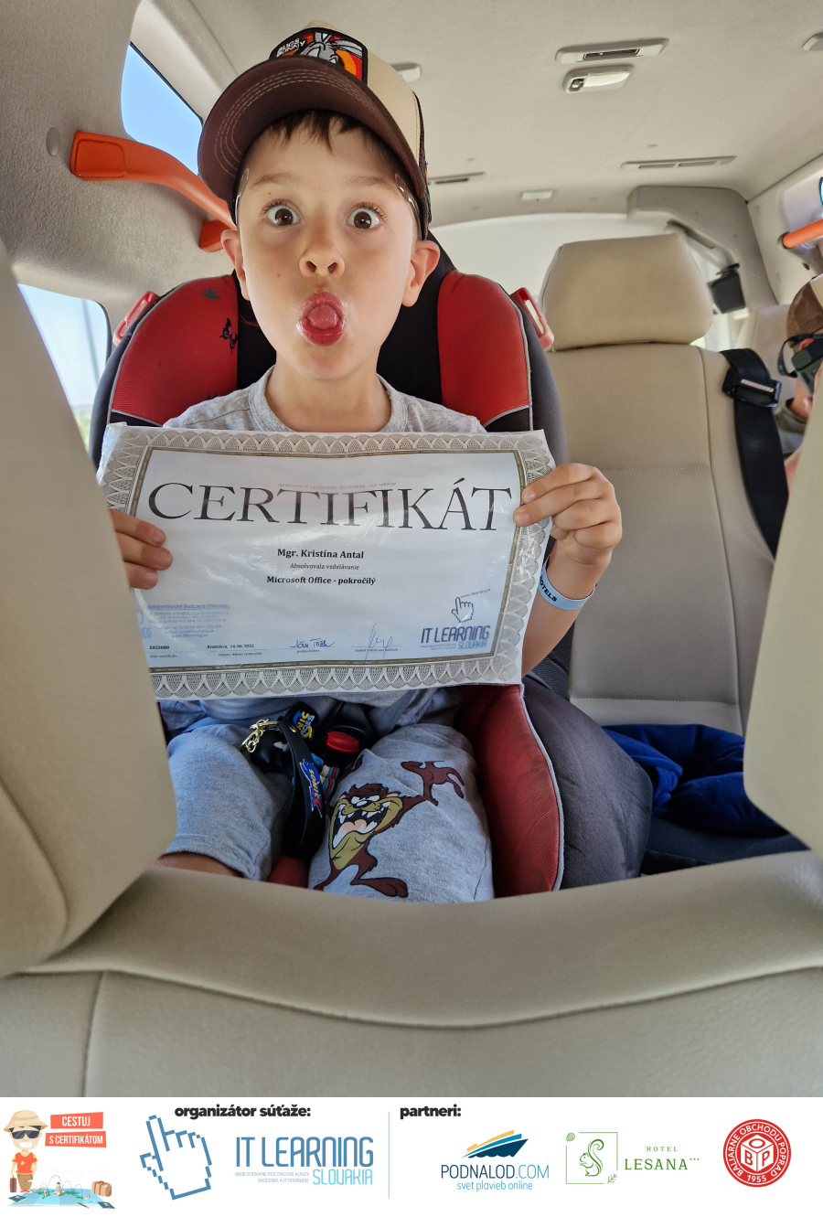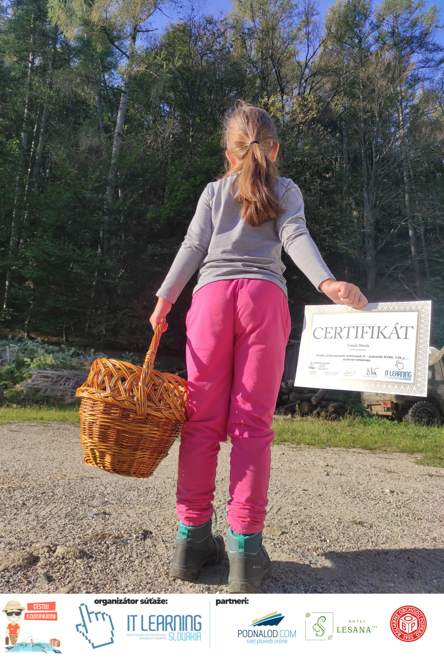 Podmienky a pravidlá súťaže: Organizátorom súťaže je akreditované školiace a IT vzdelávacie stredisko IT LEARNING SLOVAKIA, s.r.o. Zmena podmienok je vyhradená. Zaslaním fotografie súhlasíte s podmienkami, ako aj s uverejnením zaslanej fotografie na našich oficiálnych webstránkach a na sociálnych sieťach. Jeden súťažiaci a teda jeden účastník kurzu môže prihlásiť maximálne 3 fotografie. Súťaž je určená výhradne pre účastníkov našich kurzov, ktorí majú certifikát vystavený na svoje meno a odovzdávanie ceny je podmienené kontrolou mena súťažiaceho s menom  na prezenčnej listine po kurze. Do súťaže sa nesmú zapojiť zamestnanci spoločnosti pracujúci na trvalý pracovný pomer, interný ani externí lektori pracujúci na živnosť či dohodu. Prihlásiť sa certifikát môžu a rodičia detí, ktorí absolvovali tábor a teda fotografiou certifikátu z tábora. Fotografie môžu byť použité na marketingové účely šírené internetovou formou. Na výhru neexistuje právny nárok. Na zaradenie fotografie do súťaže taktiež nevzniká nárok a vyhradzujeme si právo na odmietnutie akejkoľvek prihlásenej fotografie bez uvedenia dôvodu. Fotografie nízkej kvality alebo zobrazujúce nevhodnú situáciu či objekt, vulgárne či, značne retušované zaradené do súťaže nebudú. Spoločnosť sa zaväzuje chrániť vaše osobné údaje, ktoré nebudú poskytnuté tretím osobám v súlade s aktuálne platným zákonom o ochrane osobných údajov GDPR. Email poskytnutý do súťaže bude výhradne použitý iba na informačné emaily ohľadom súťaže. Zmena pravidiel, cien v súťaži či termínov odovzdávania cien a pravidiel vyhradená. Všetky výhry prislúchajú výhradne súťažiacemu a výhercovi, ktorý ju smie využiť a je neprenosná. Pobytové poukazy a zájazdy sú viazané na meno účastníka v súťaži. Prístup do VideoClass sa aktivuje automaticky na e-mail, z ktorého bola odoslaná registrácia fotografie, a to na obdobie 60 dní od schválenia a overenia fotografie našimi zamestnancami.