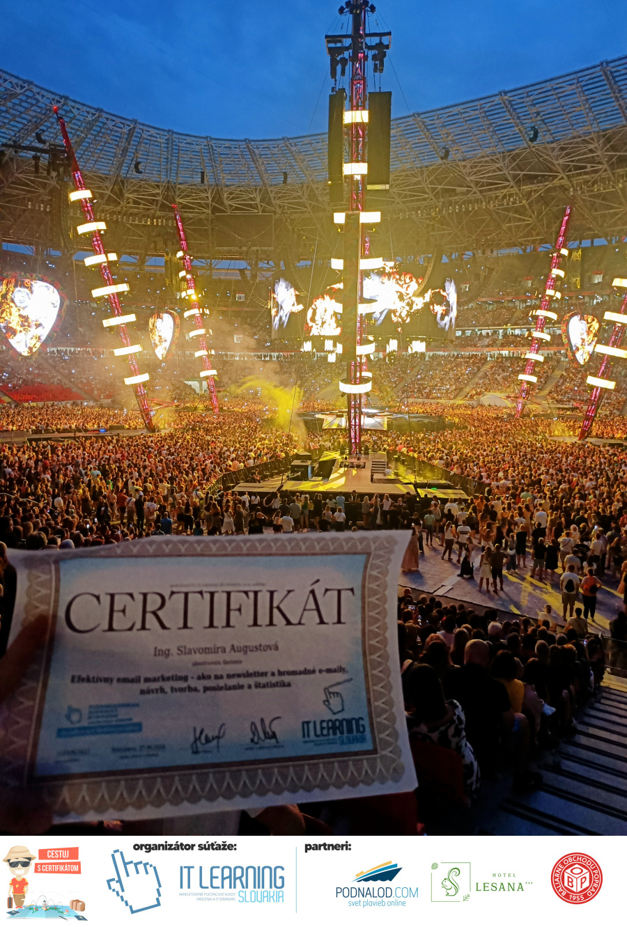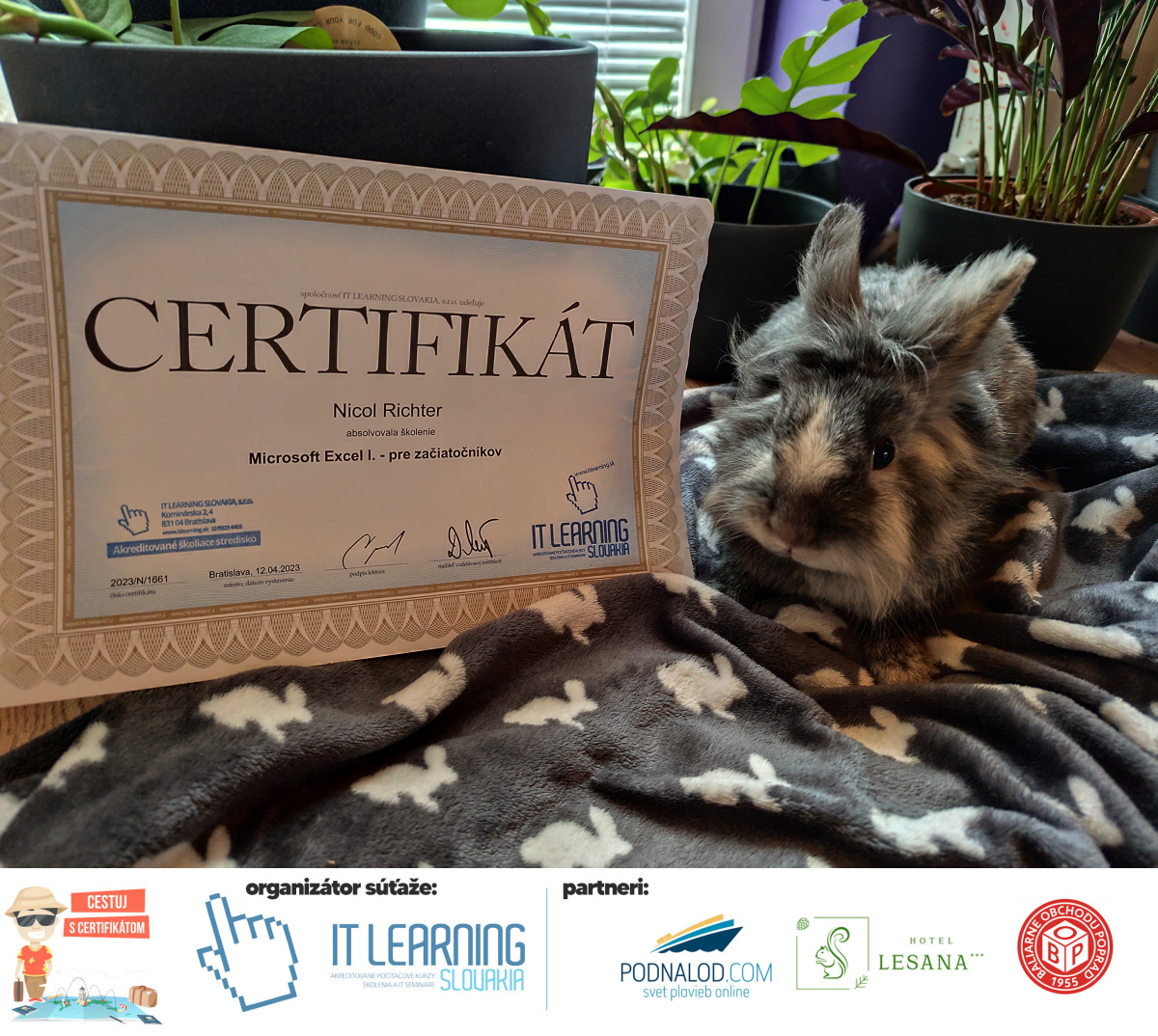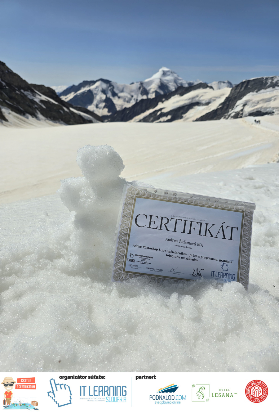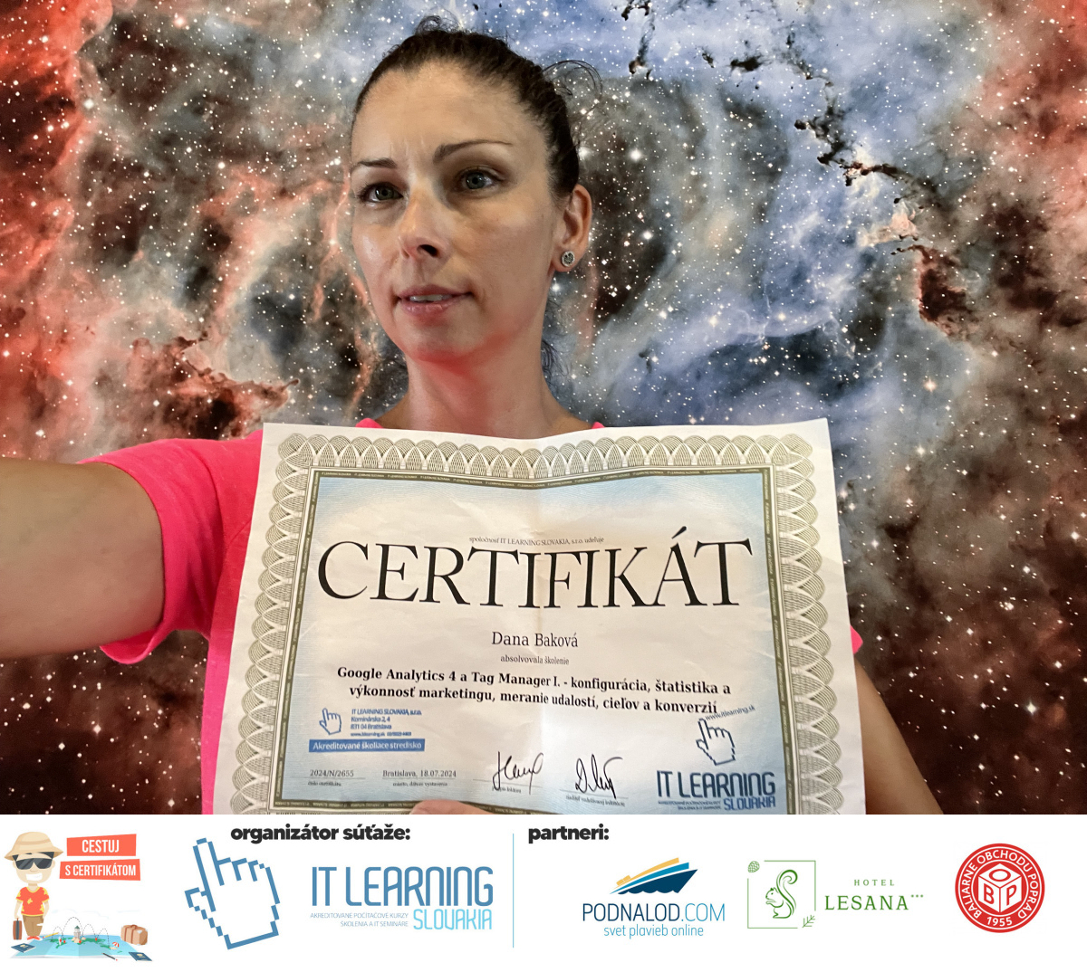 Podmienky a pravidlá súťaže: Organizátorom súťaže je akreditované školiace a IT vzdelávacie stredisko IT LEARNING SLOVAKIA, s.r.o. Zmena podmienok je vyhradená. Zaslaním fotografie súhlasíte s podmienkami, ako aj s uverejnením zaslanej fotografie na našich oficiálnych webstránkach a na sociálnych sieťach. Jeden súťažiaci a teda jeden účastník kurzu môže prihlásiť maximálne 3 fotografie. Súťaž je určená výhradne pre účastníkov našich kurzov, ktorí majú certifikát vystavený na svoje meno a odovzdávanie ceny je podmienené kontrolou mena súťažiaceho s menom  na prezenčnej listine po kurze. Do súťaže sa nesmú zapojiť zamestnanci spoločnosti pracujúci na trvalý pracovný pomer, interný ani externí lektori pracujúci na živnosť či dohodu. Prihlásiť sa certifikát môžu a rodičia detí, ktorí absolvovali tábor a teda fotografiou certifikátu z tábora. Fotografie môžu byť použité na marketingové účely šírené internetovou formou. Na výhru neexistuje právny nárok. Na zaradenie fotografie do súťaže taktiež nevzniká nárok a vyhradzujeme si právo na odmietnutie akejkoľvek prihlásenej fotografie bez uvedenia dôvodu. Fotografie nízkej kvality alebo zobrazujúce nevhodnú situáciu či objekt, vulgárne či, značne retušované zaradené do súťaže nebudú. Spoločnosť sa zaväzuje chrániť vaše osobné údaje, ktoré nebudú poskytnuté tretím osobám v súlade s aktuálne platným zákonom o ochrane osobných údajov GDPR. Email poskytnutý do súťaže bude výhradne použitý iba na informačné emaily ohľadom súťaže. Zmena pravidiel, cien v súťaži či termínov odovzdávania cien a pravidiel vyhradená. Všetky výhry prislúchajú výhradne súťažiacemu a výhercovi, ktorý ju smie využiť a je neprenosná. Pobytové poukazy a zájazdy sú viazané na meno účastníka v súťaži. Prístup do VideoClass sa aktivuje automaticky na e-mail, z ktorého bola odoslaná registrácia fotografie, a to na obdobie 60 dní od schválenia a overenia fotografie našimi zamestnancami.