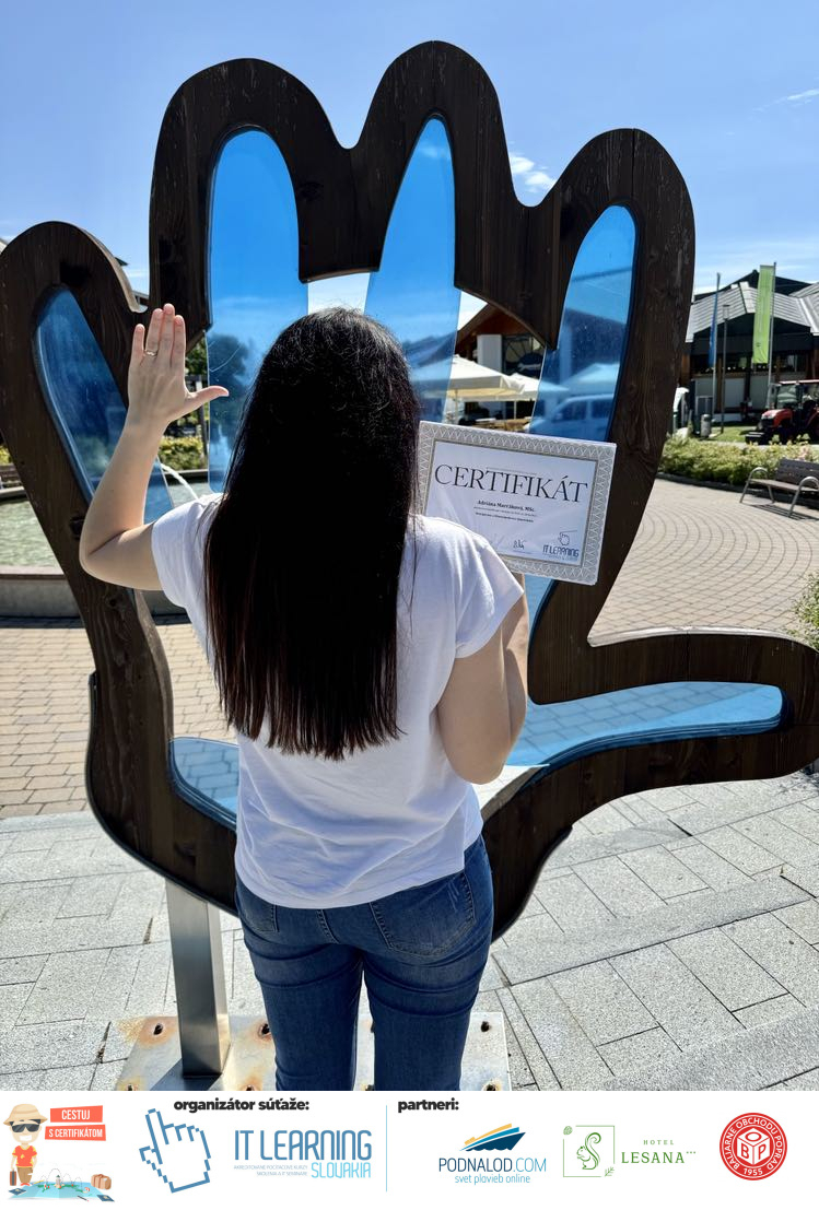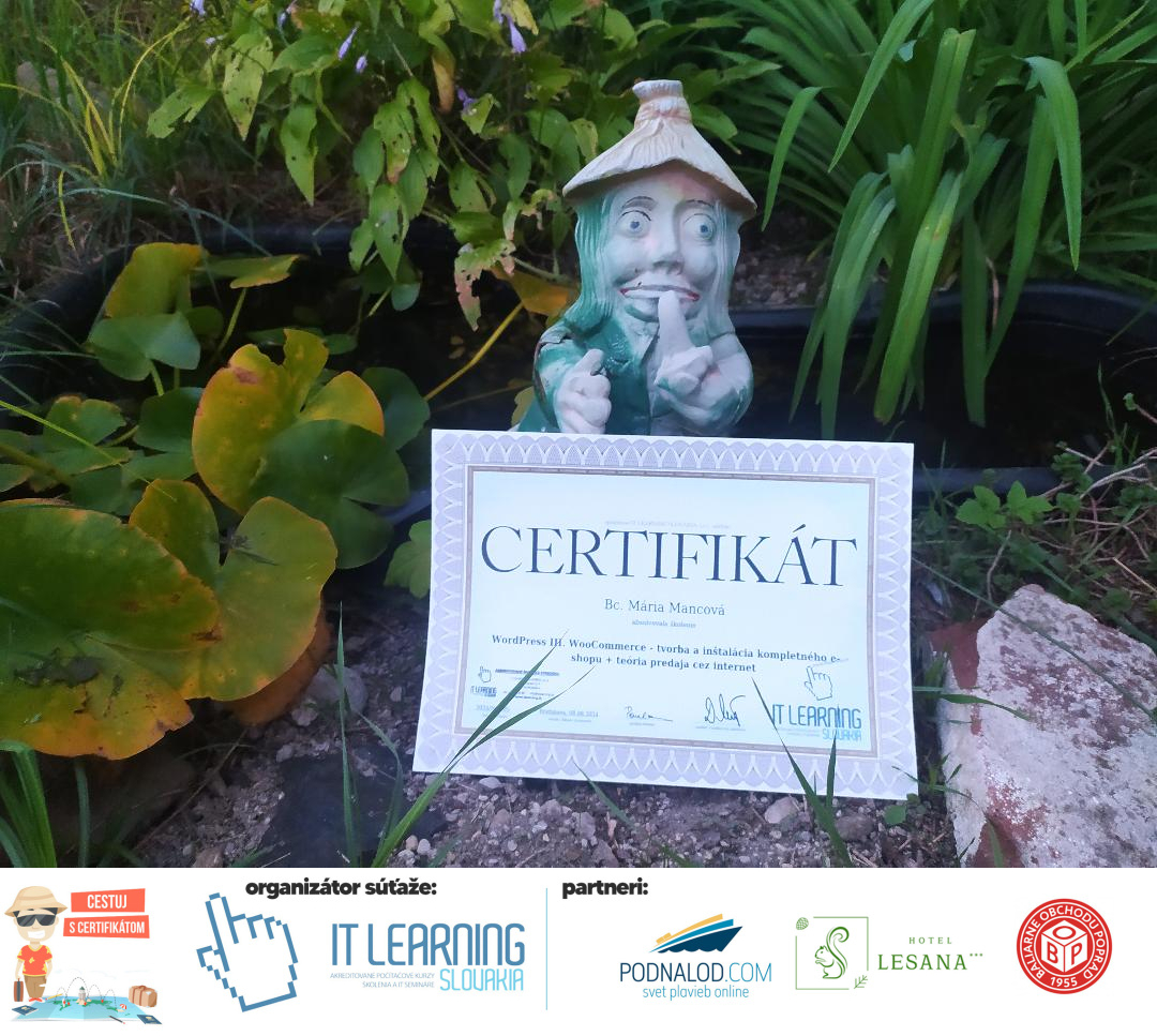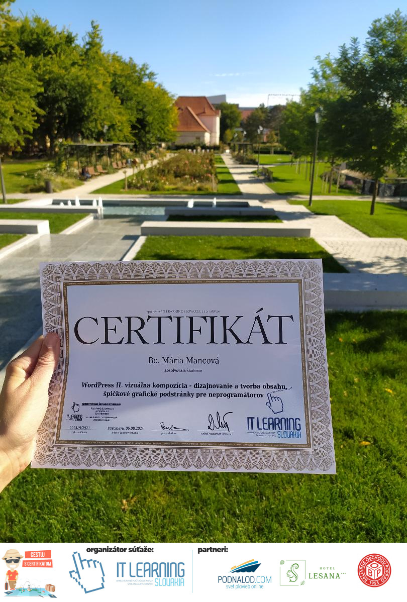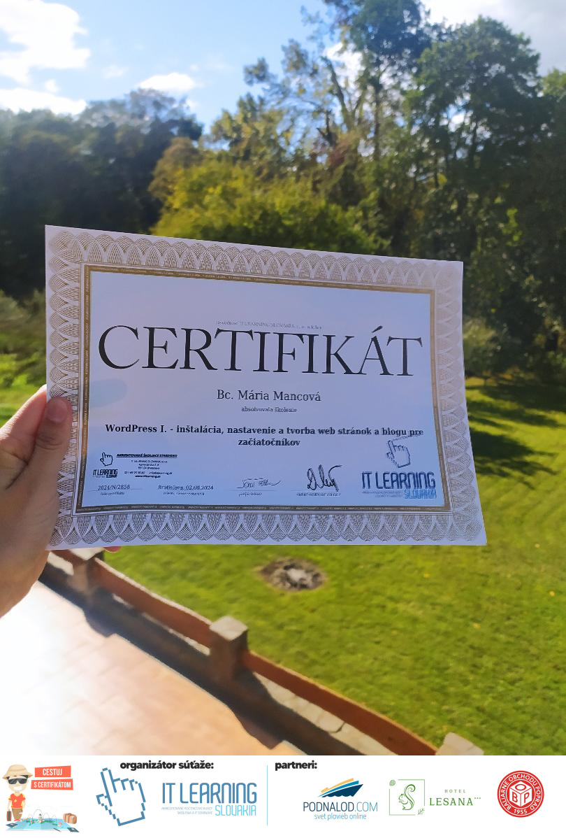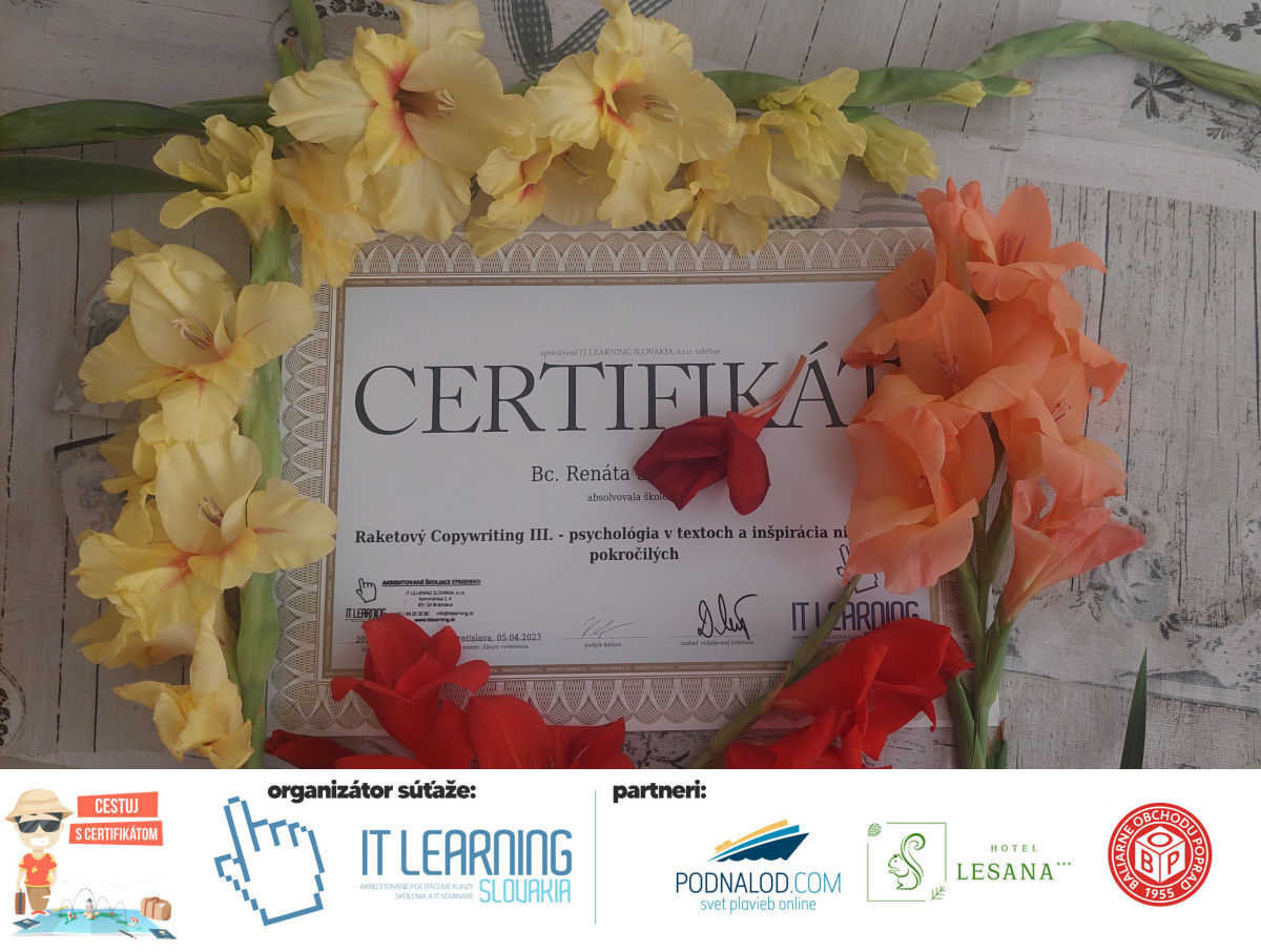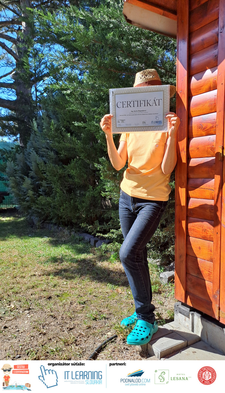 Boli ste u nás niekedy na kurze? Online alebo v našej učebni? To je skvelé, pretože určite máte z kurzu certifikát. Zoberte tento rok svoj certifikát, ktorý ste u nás získali so sebou na dovolenku, či kamkoľvek na výlet, do záhrady, na chatu, na párty, k vode, na čln, do Tatier, či na Rysy alebo len tak na prechádzku, či na túru do lesa, do ZOO alebo na hrad, na balón, do lietadla, do parku, či na pieskovisko – proste kamkoľvek, kde sa cítite dobre a pošlite nám fotku, na ktorej s vami certifikát relaxuje a hrajte o fantastické ceny! Chceme náš (vlastne jednoznačne už váš) certifikát vidieť inde ako na stene, v šuflíku alebo v skrinke.