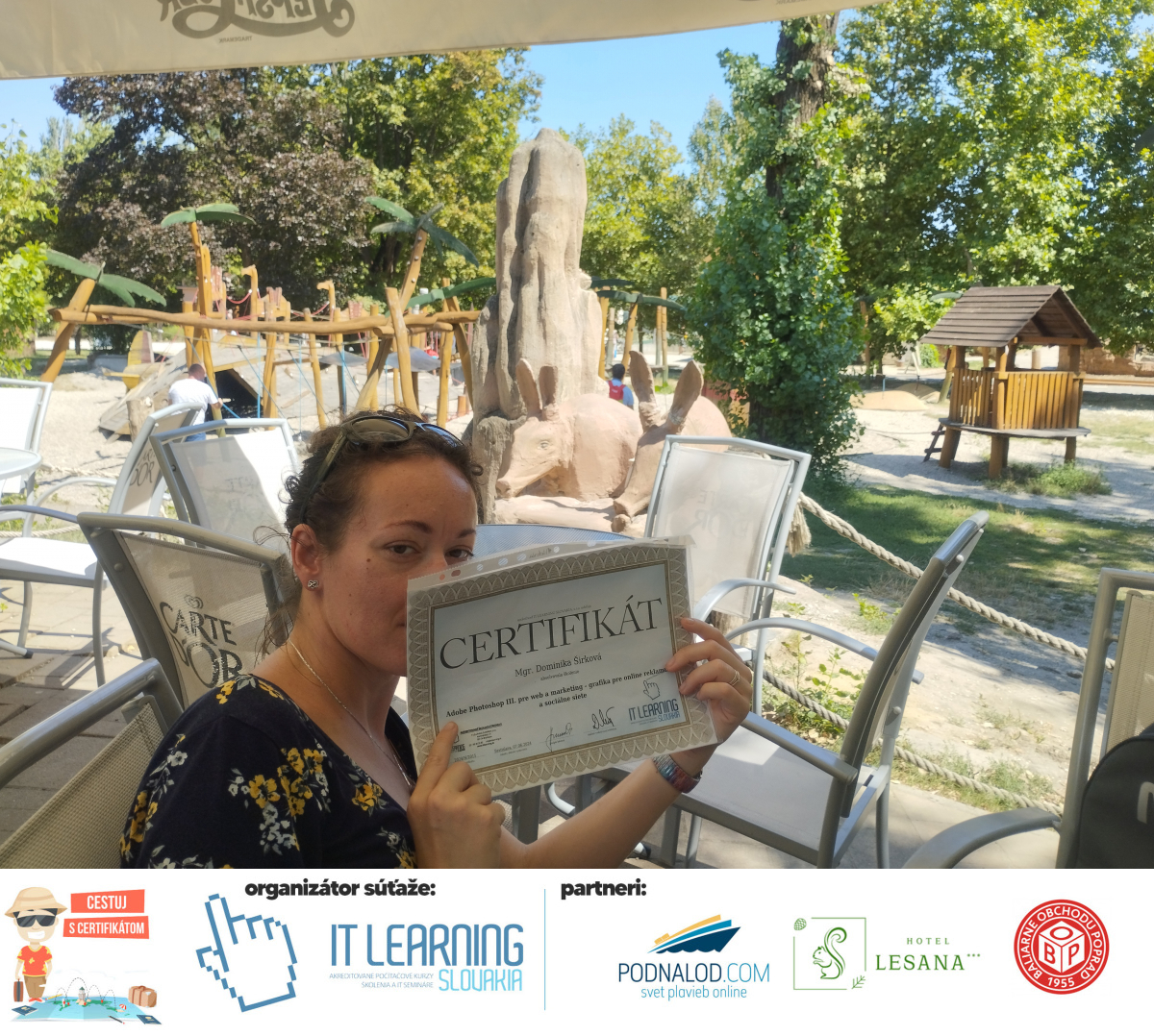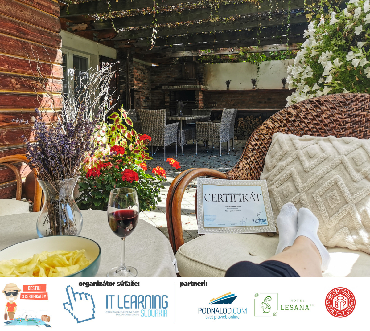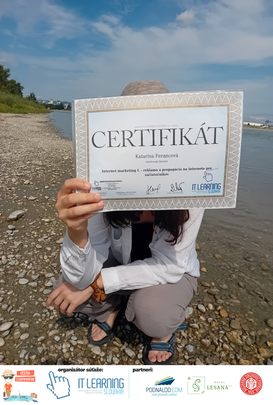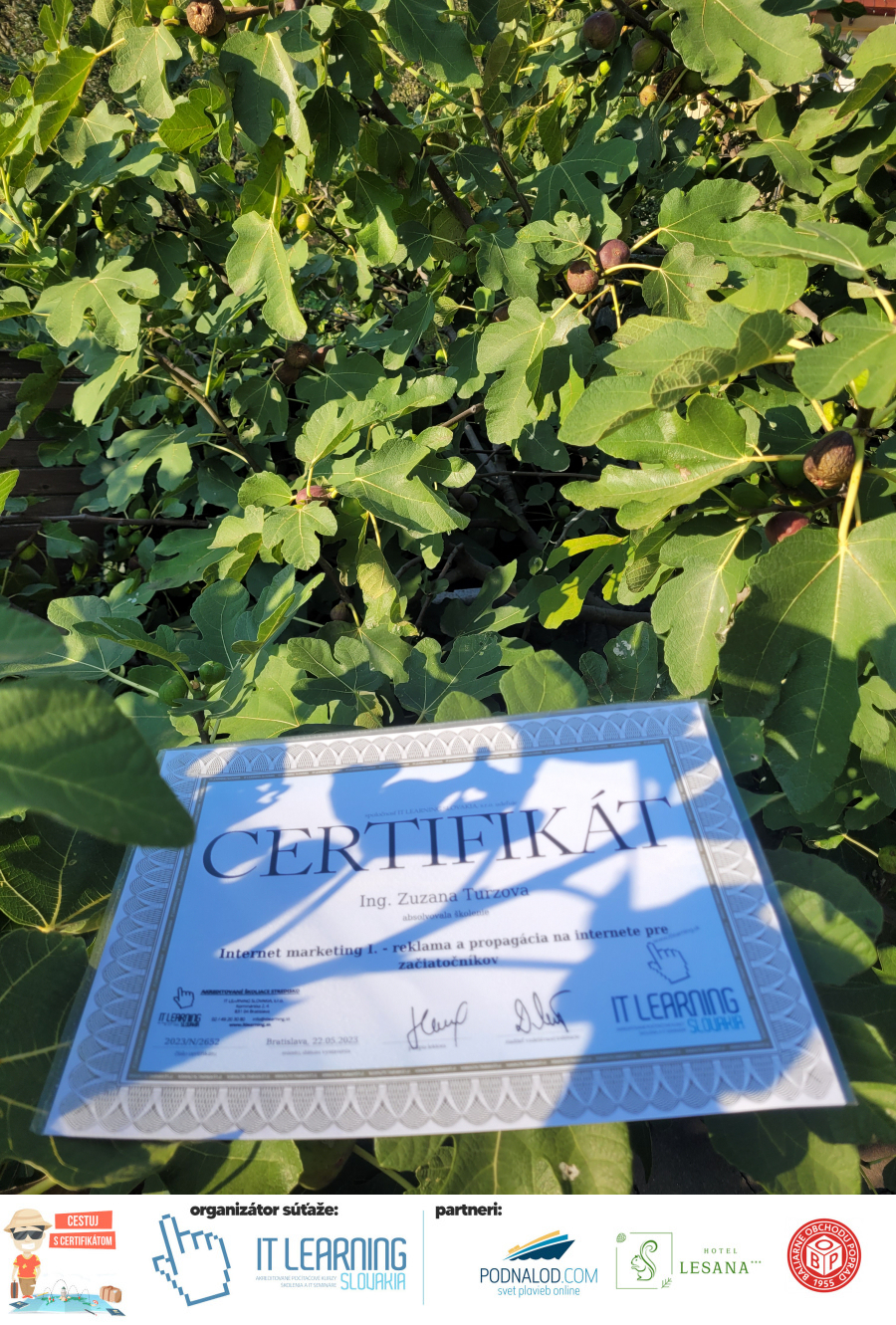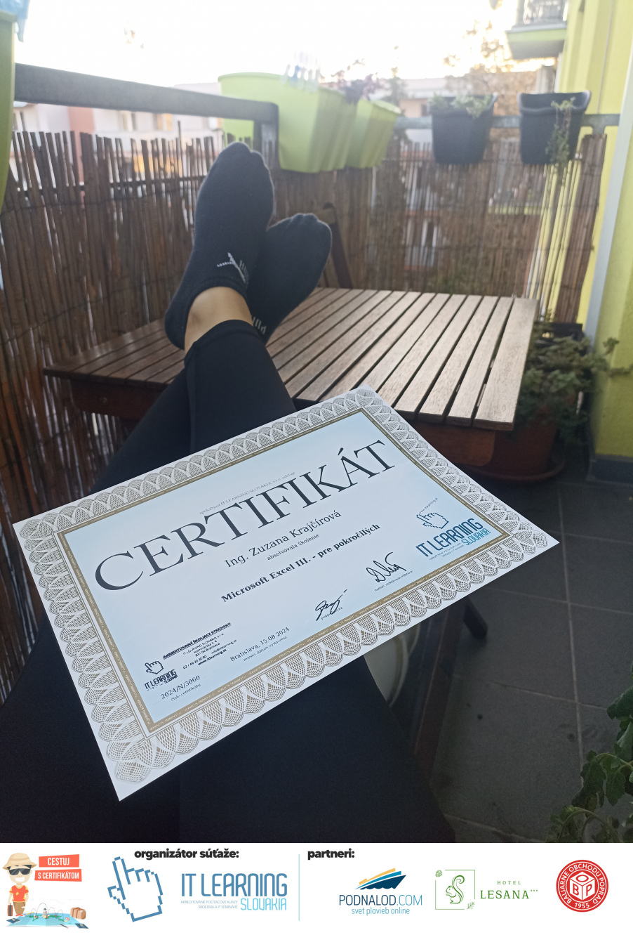 Boli ste u nás niekedy na kurze? Online alebo v našej učebni? To je skvelé, pretože určite máte z kurzu certifikát. Zoberte tento rok svoj certifikát, ktorý ste u nás získali so sebou na dovolenku, či kamkoľvek na výlet, do záhrady, na chatu, na párty, k vode, na čln, do Tatier, či na Rysy alebo len tak na prechádzku, či na túru do lesa, do ZOO alebo na hrad, na balón, do lietadla, do parku, či na pieskovisko – proste kamkoľvek, kde sa cítite dobre a pošlite nám fotku, na ktorej s vami certifikát relaxuje a hrajte o fantastické ceny! Chceme náš (vlastne jednoznačne už váš) certifikát vidieť inde ako na stene, v šuflíku alebo v skrinke.