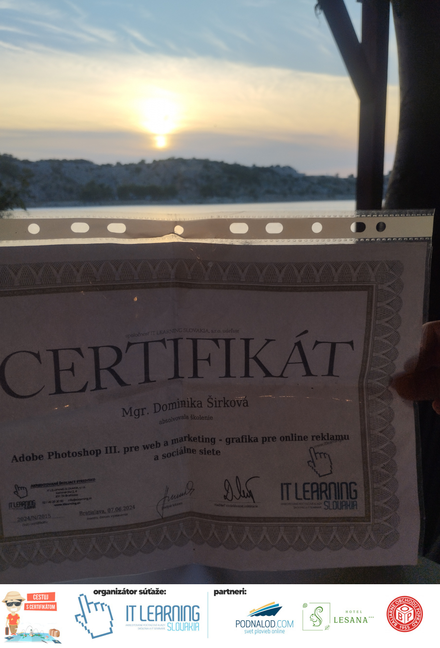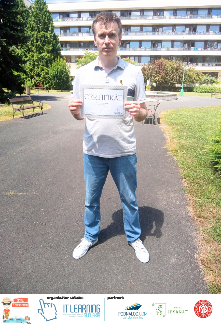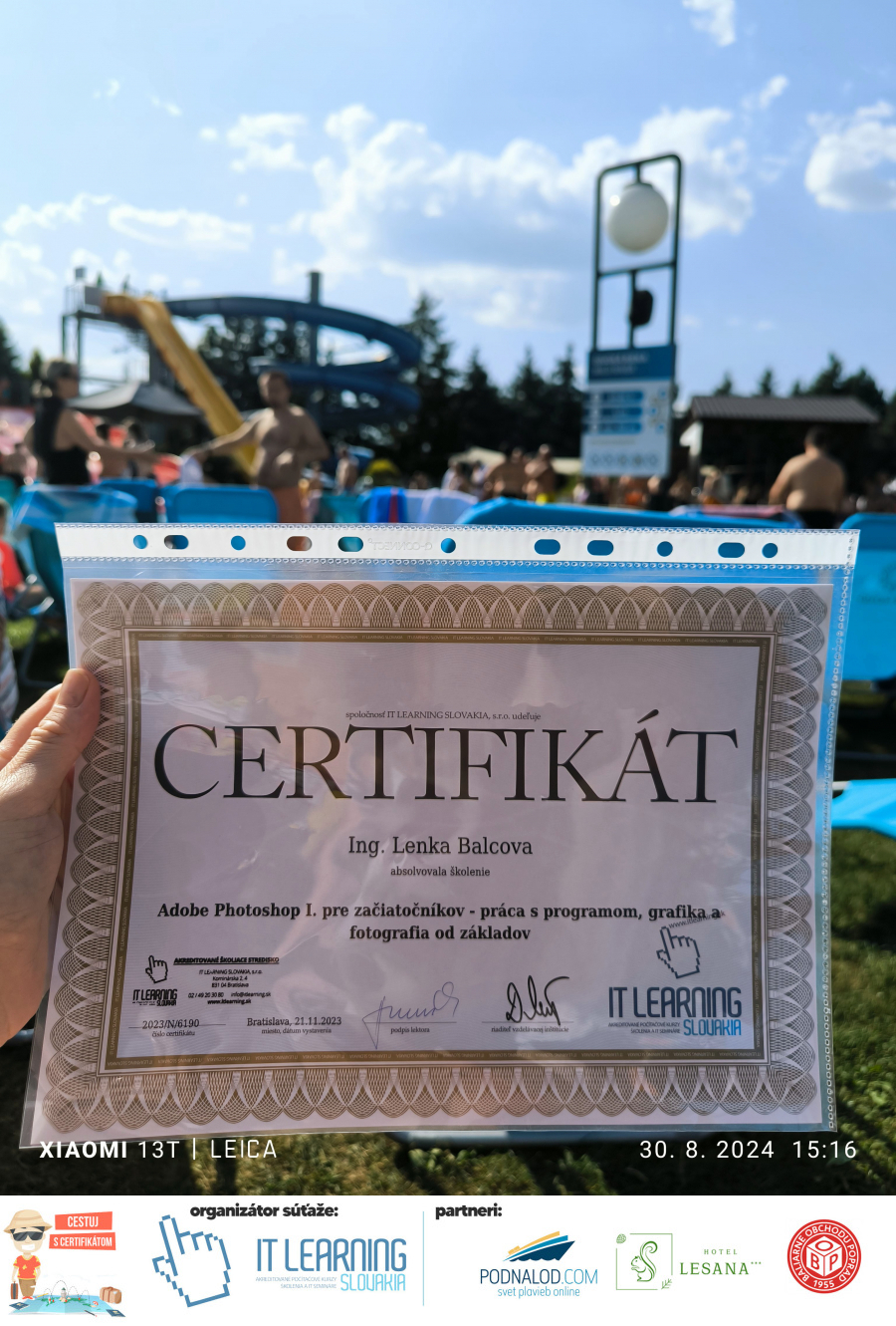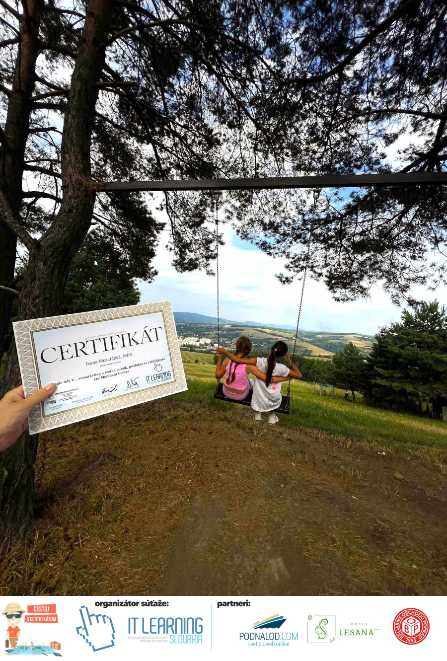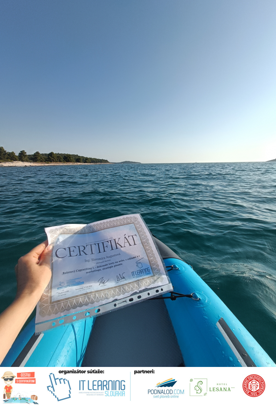 Boli ste u nás niekedy na kurze? Online alebo v našej učebni? To je skvelé, pretože určite máte z kurzu certifikát. Zoberte tento rok svoj certifikát, ktorý ste u nás získali so sebou na dovolenku, či kamkoľvek na výlet, do záhrady, na chatu, na párty, k vode, na čln, do Tatier, či na Rysy alebo len tak na prechádzku, či na túru do lesa, do ZOO alebo na hrad, na balón, do lietadla, do parku, či na pieskovisko – proste kamkoľvek, kde sa cítite dobre a pošlite nám fotku, na ktorej s vami certifikát relaxuje a hrajte o fantastické ceny! Chceme náš (vlastne jednoznačne už váš) certifikát vidieť inde ako na stene, v šuflíku alebo v skrinke.