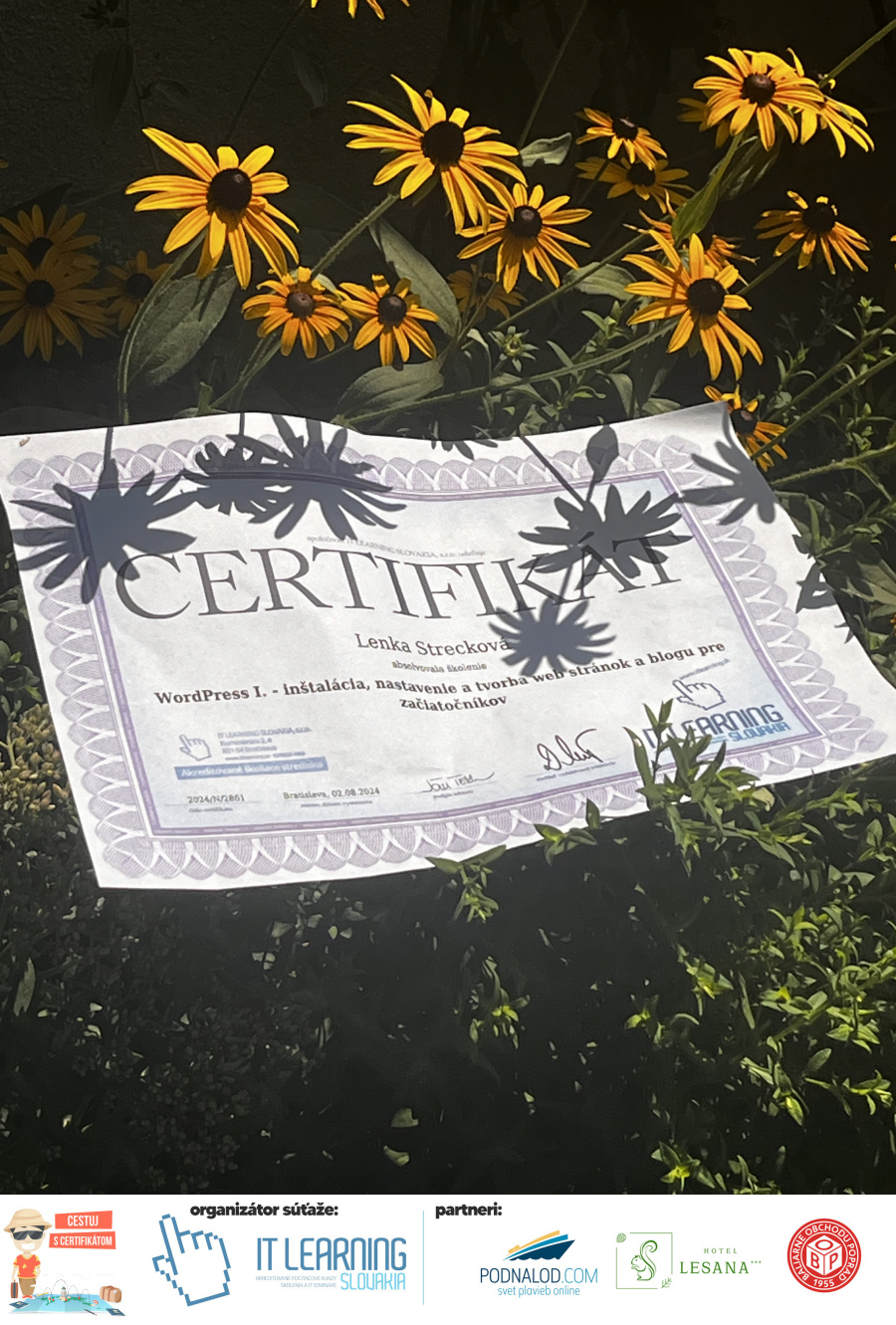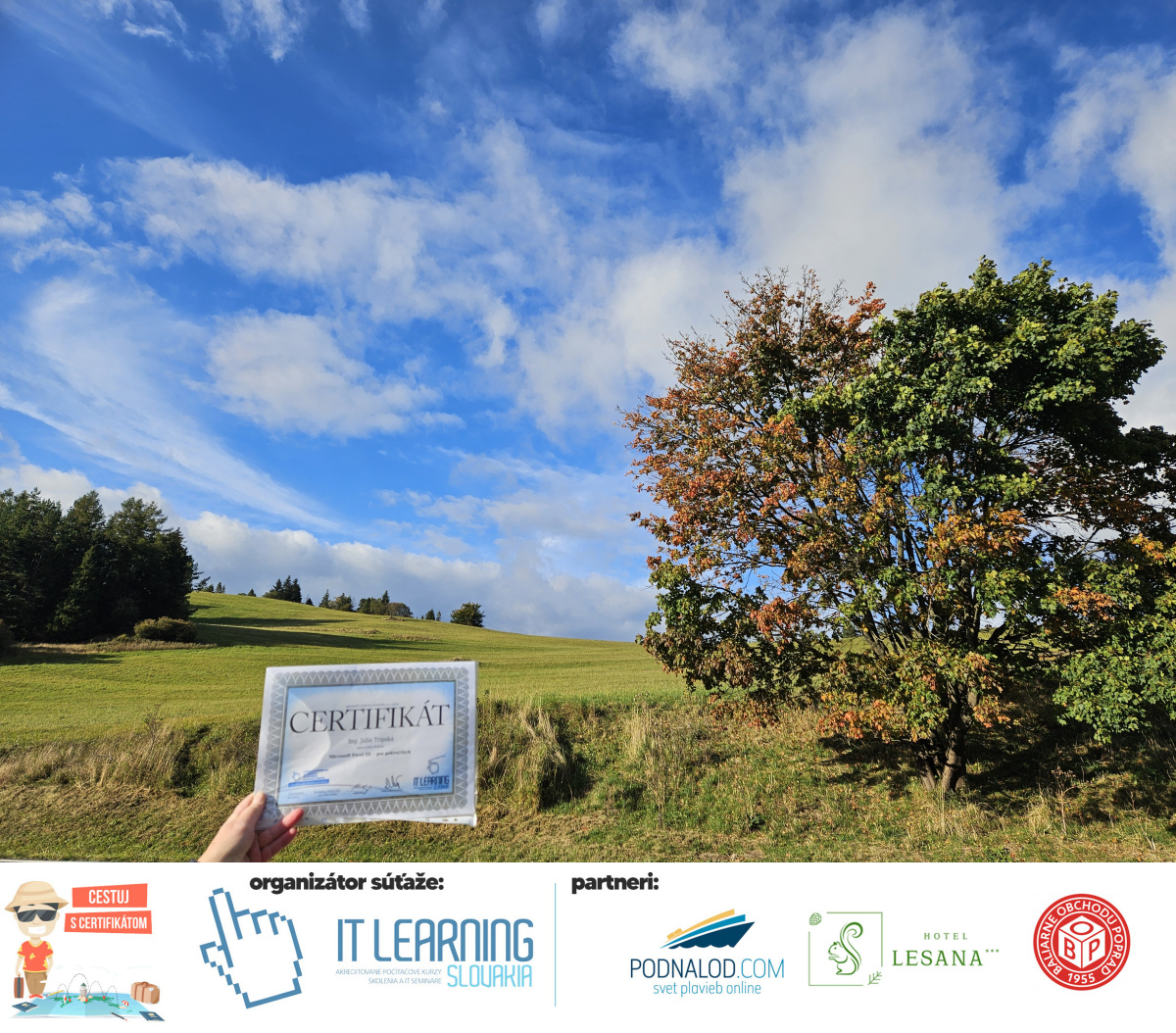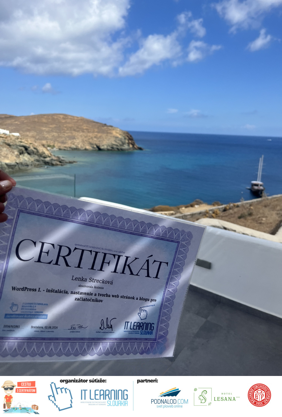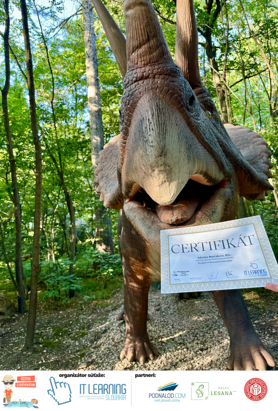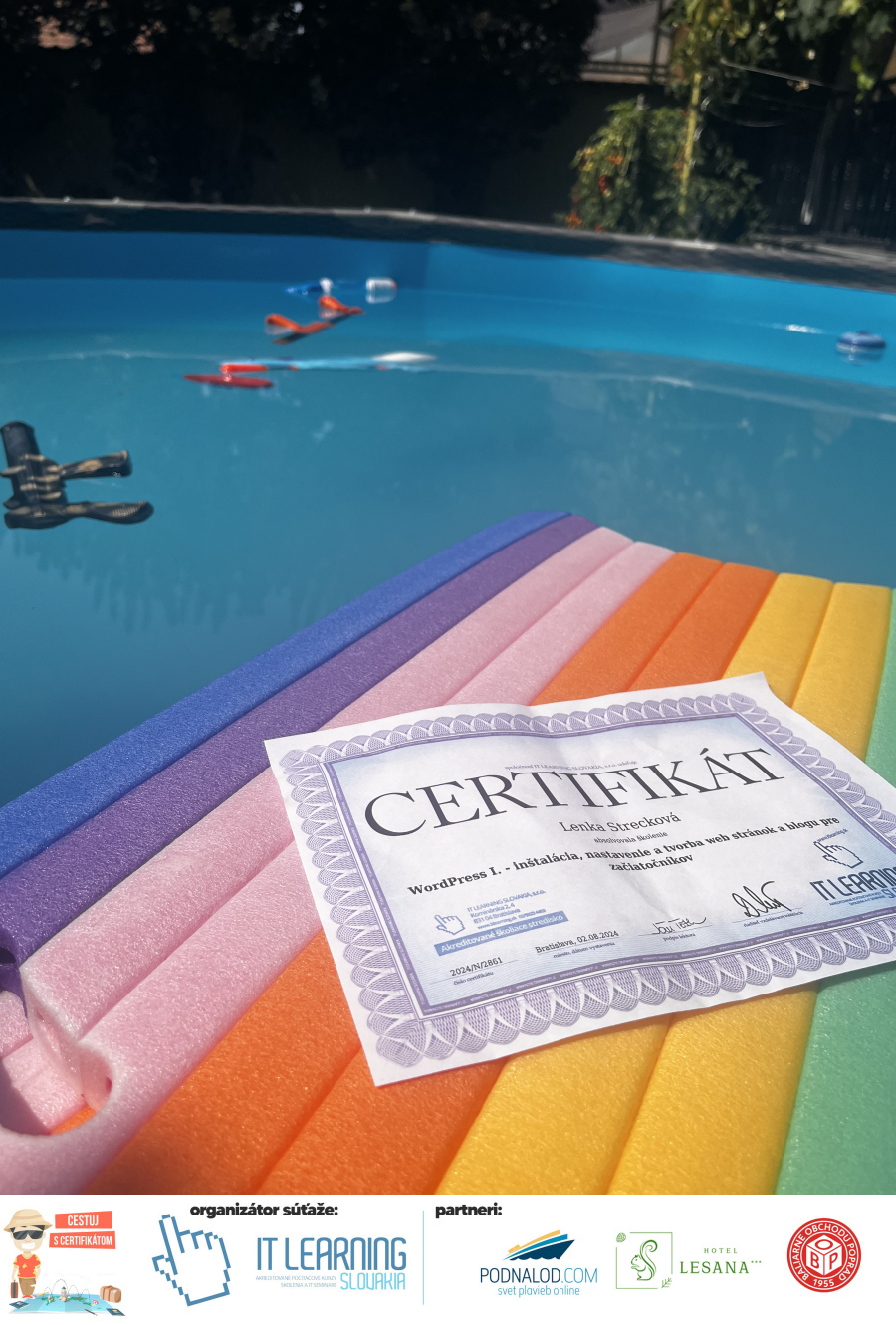 Boli ste u nás niekedy na kurze? Online alebo v našej učebni? To je skvelé, pretože určite máte z kurzu certifikát. Zoberte tento rok svoj certifikát, ktorý ste u nás získali so sebou na dovolenku, či kamkoľvek na výlet, do záhrady, na chatu, na párty, k vode, na čln, do Tatier, či na Rysy alebo len tak na prechádzku, či na túru do lesa, do ZOO alebo na hrad, na balón, do lietadla, do parku, či na pieskovisko – proste kamkoľvek, kde sa cítite dobre a pošlite nám fotku, na ktorej s vami certifikát relaxuje a hrajte o fantastické ceny! Chceme náš (vlastne jednoznačne už váš) certifikát vidieť inde ako na stene, v šuflíku alebo v skrinke.