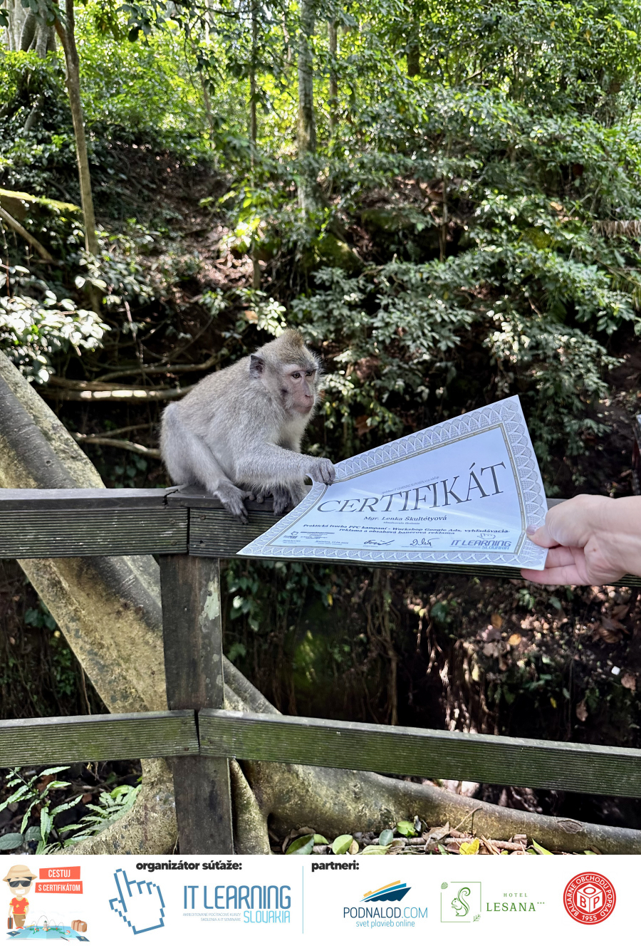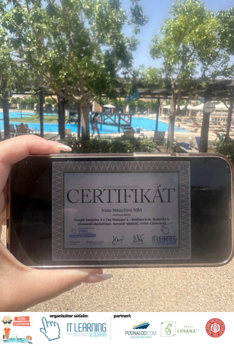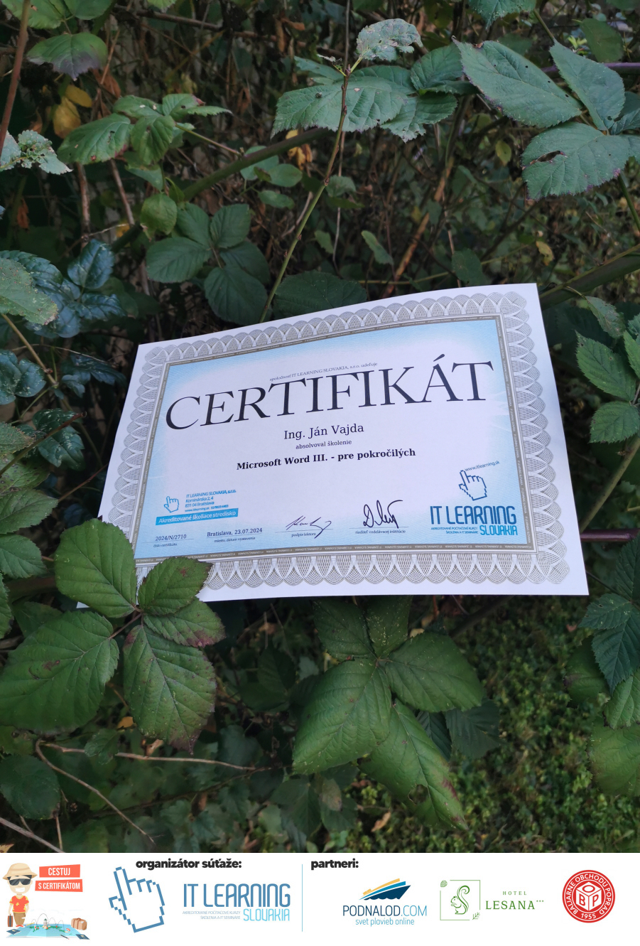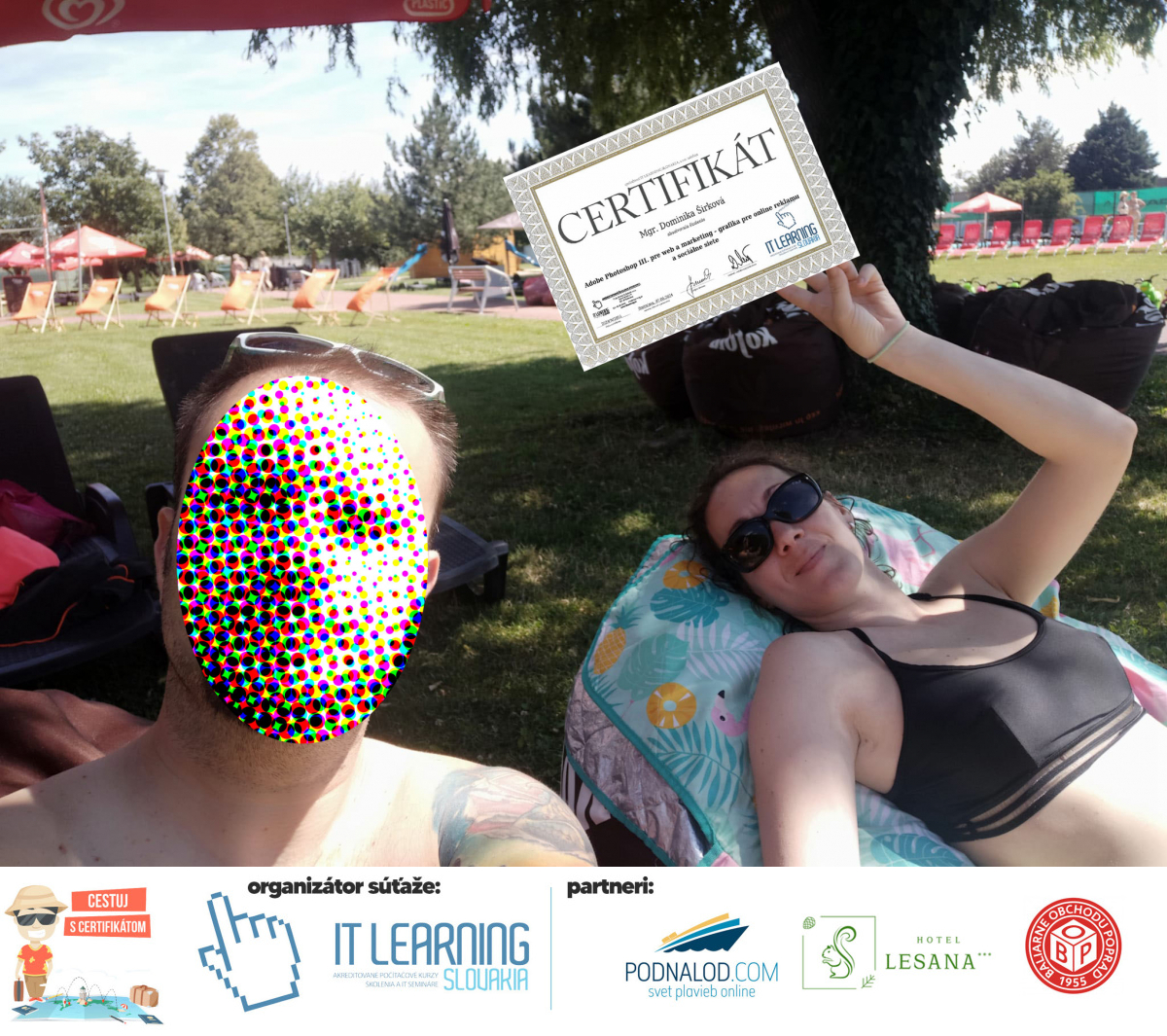Boli ste u nás niekedy na kurze? Online alebo v našej učebni? To je skvelé, pretože určite máte z kurzu certifikát. Zoberte tento rok svoj certifikát, ktorý ste u nás získali so sebou na dovolenku, či kamkoľvek na výlet, do záhrady, na chatu, na párty, k vode, na čln, do Tatier, či na Rysy alebo len tak na prechádzku, či na túru do lesa, do ZOO alebo na hrad, na balón, do lietadla, do parku, či na pieskovisko – proste kamkoľvek, kde sa cítite dobre a pošlite nám fotku, na ktorej s vami certifikát relaxuje a hrajte o fantastické ceny! Chceme náš (vlastne jednoznačne už váš) certifikát vidieť inde ako na stene, v šuflíku alebo v skrinke.