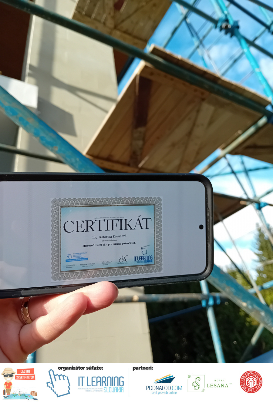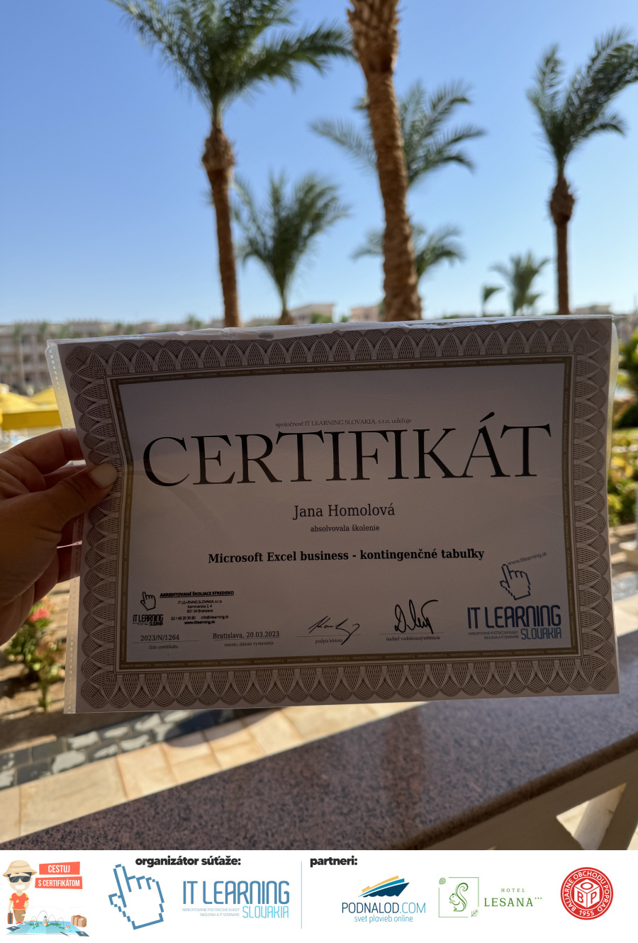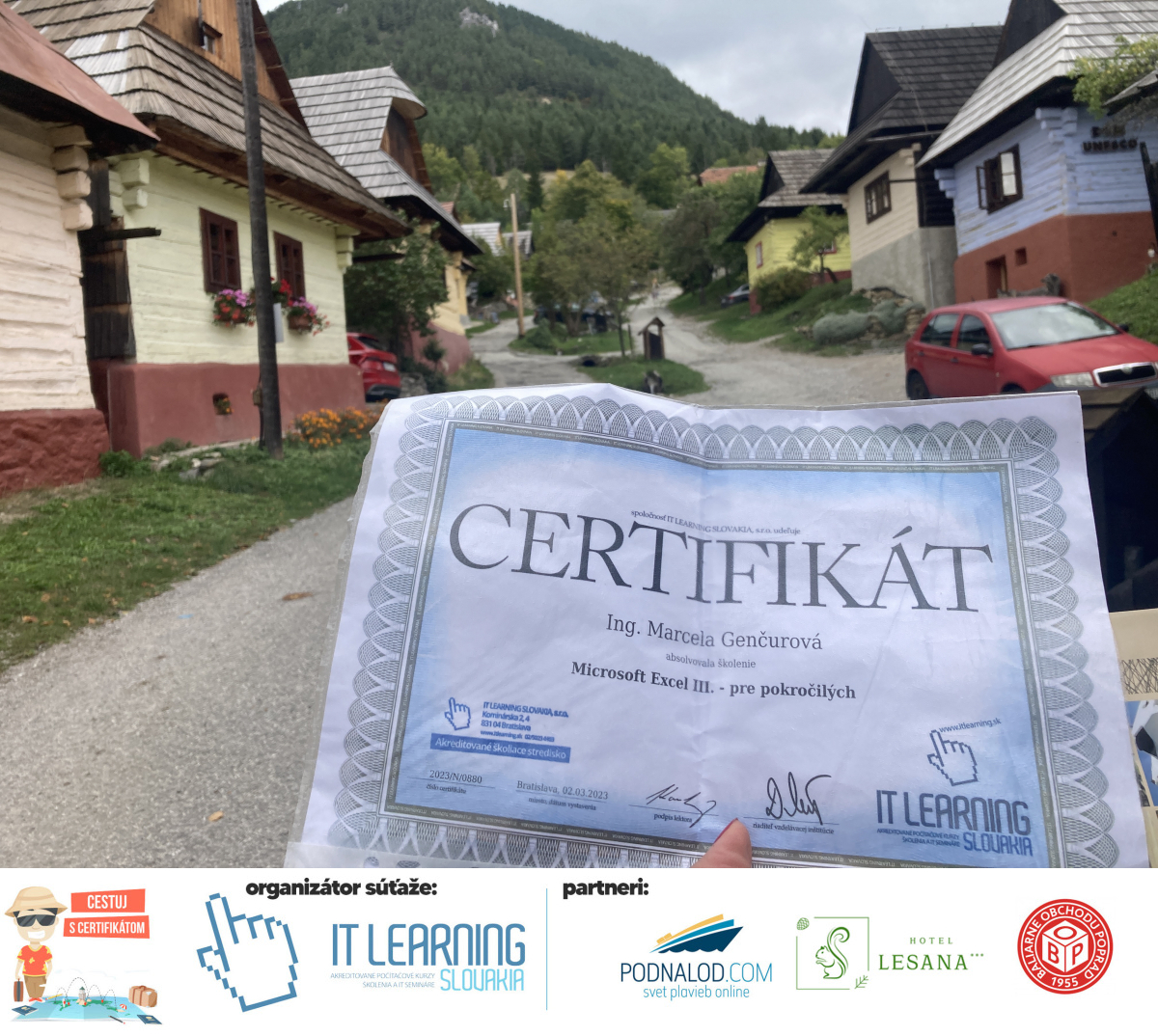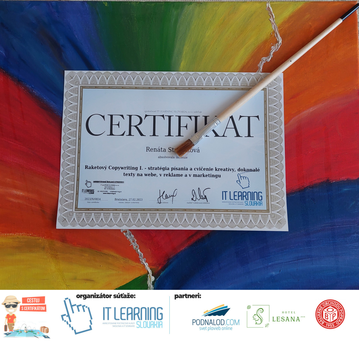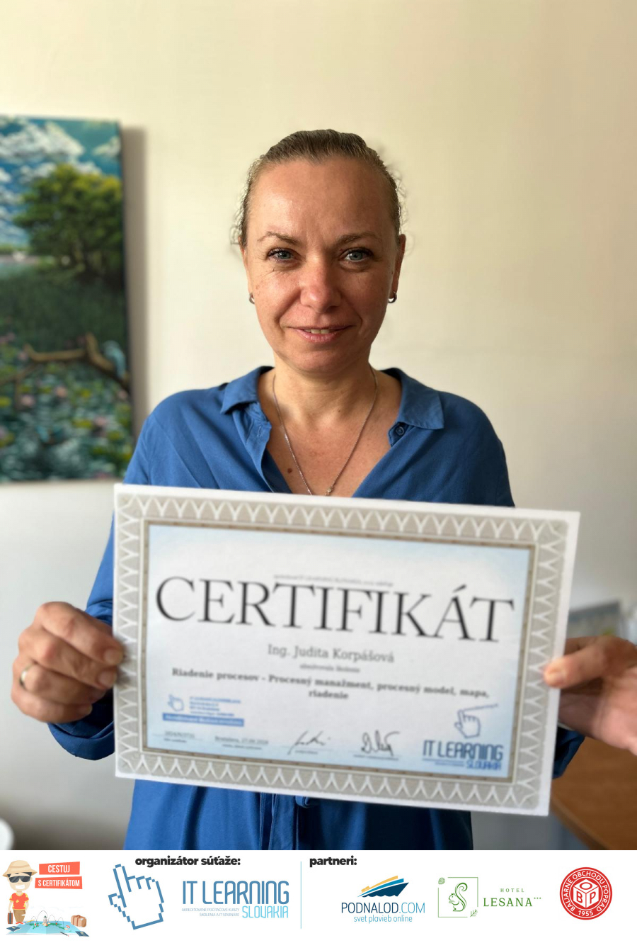 Boli ste u nás niekedy na kurze? Online alebo v našej učebni? To je skvelé, pretože určite máte z kurzu certifikát. Zoberte tento rok svoj certifikát, ktorý ste u nás získali so sebou na dovolenku, či kamkoľvek na výlet, do záhrady, na chatu, na párty, k vode, na čln, do Tatier, či na Rysy alebo len tak na prechádzku, či na túru do lesa, do ZOO alebo na hrad, na balón, do lietadla, do parku, či na pieskovisko – proste kamkoľvek, kde sa cítite dobre a pošlite nám fotku, na ktorej s vami certifikát relaxuje a hrajte o fantastické ceny! Chceme náš (vlastne jednoznačne už váš) certifikát vidieť inde ako na stene, v šuflíku alebo v skrinke.